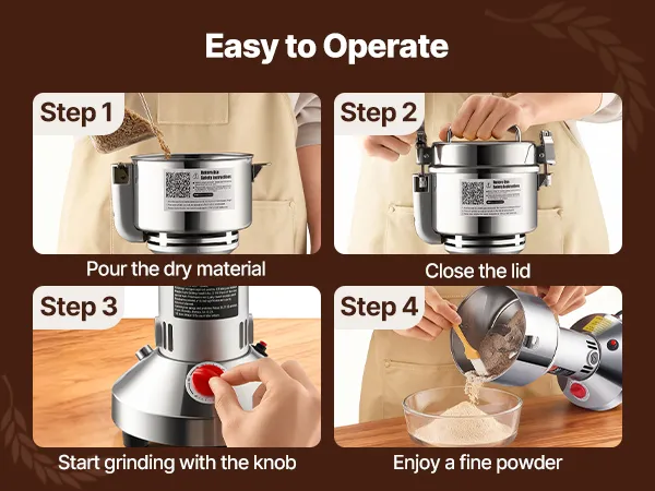 • Wielofunkcyjny młynek do mielenia na sucho: Ta maszyna do mielenia proszków może przetwarzać różne suszone materiały, w tym: ① Zboża (soja, kukurydza, jęczmień, pszenica, owies, żyto, groch, ziarna kawy) ② Przyprawy (koper włoski, pieprz, cynamon, rozmaryn) ③ Inne (w przypadku mielenia innych twardych materiałów należy je najpierw pokroić na małe kawałki). (Nie nadaje się do materiałów mokrych, świeżych, oleistych lub lepkich). Szeroko stosowany w domach, kuchniach, szpitalach i fabrykach farmaceutycznych.