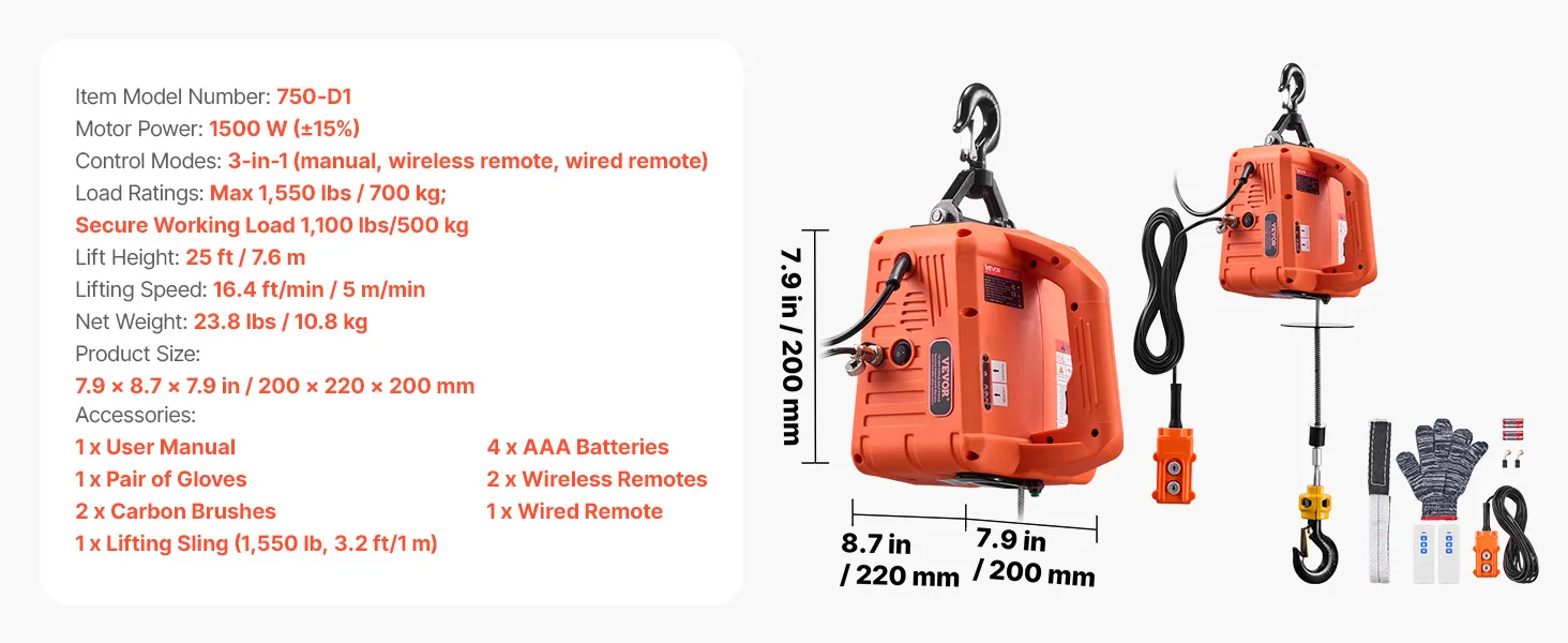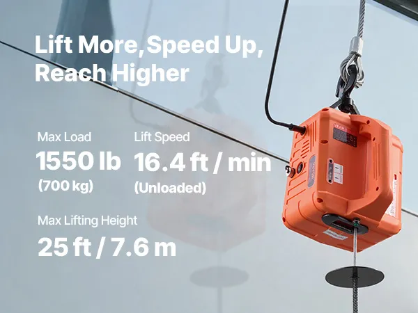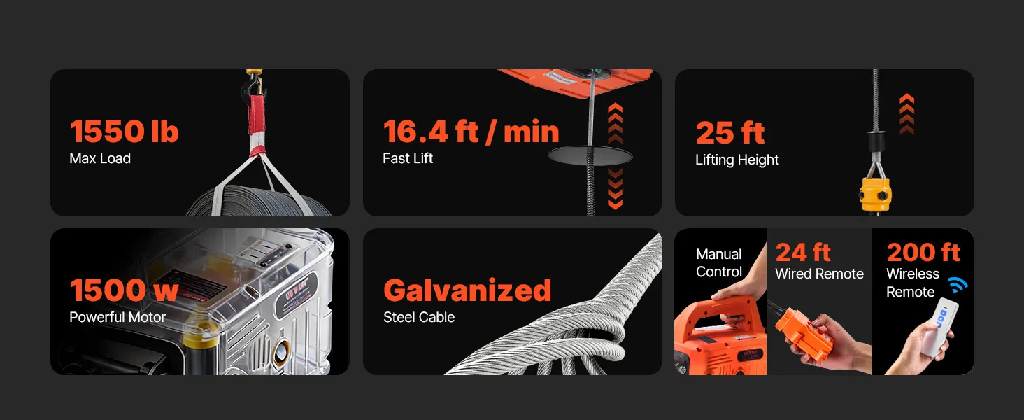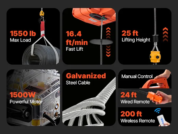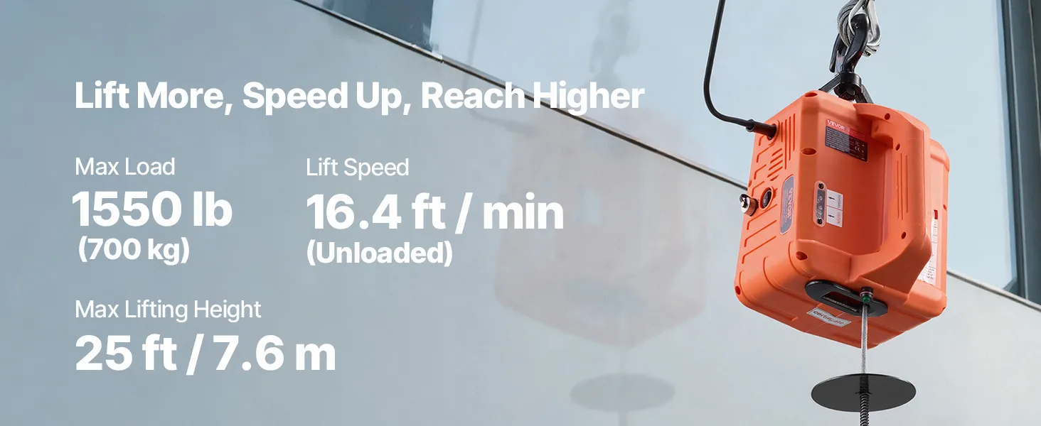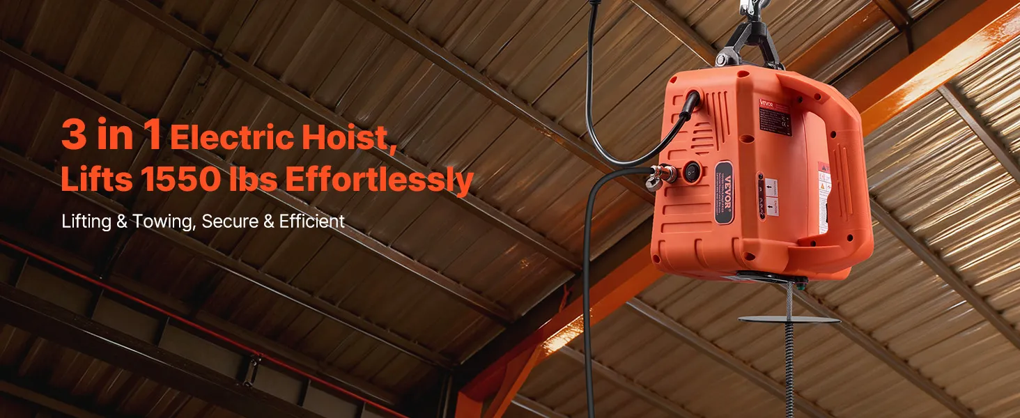 Our portable electric hoist packs a 1500W motor and handles up to 1,550 lb. It lifts to 25 ft at up to 16.4 ft/min. 3-in-1 control covers manual, 24 ft wired, and 200 ft wireless. Dual security braking stops on power loss. It lifts or pulls for home, jobsites, stores, and farms.