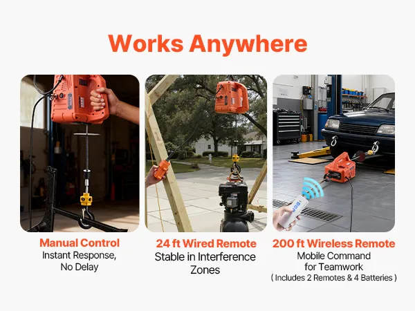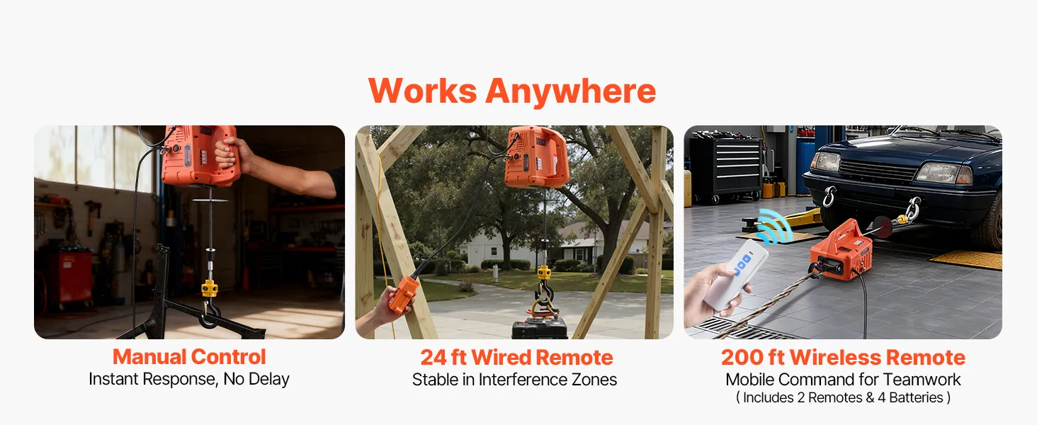 3-in-1 Easy Control: This power electric hoist tackles vertical lifts and horizontal pulls in one unit. The handle buttons respond fast, the 24 ft wired remote delivers precise close control, and the 200 ft wireless remote supports mobile teamwork