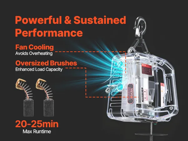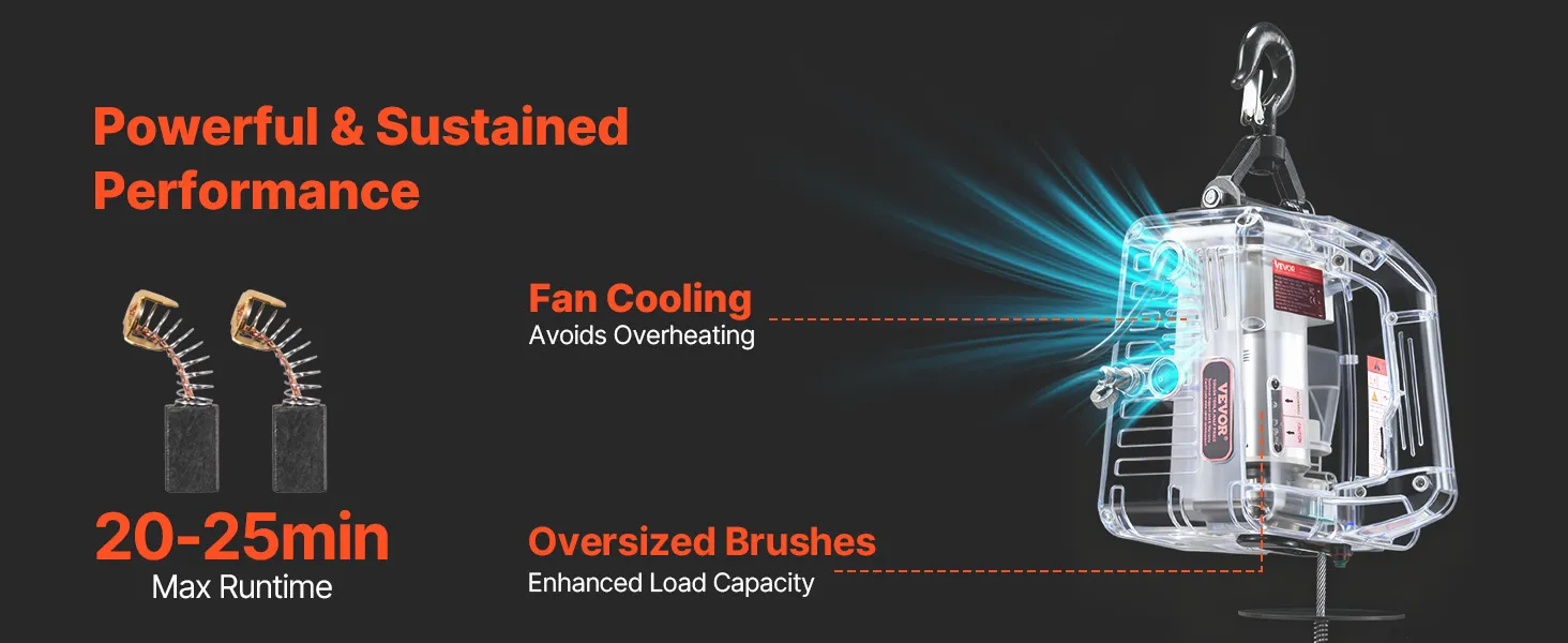 Durable, Reliable Motor: This electric winch crane uses a 1500 W motor with forced-fan cooling and enlarged carbon brushes. The design helps deliver steady output and longer working time for everyday tasks