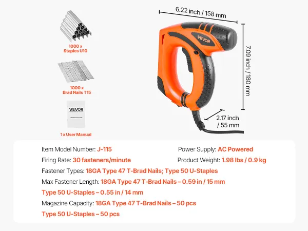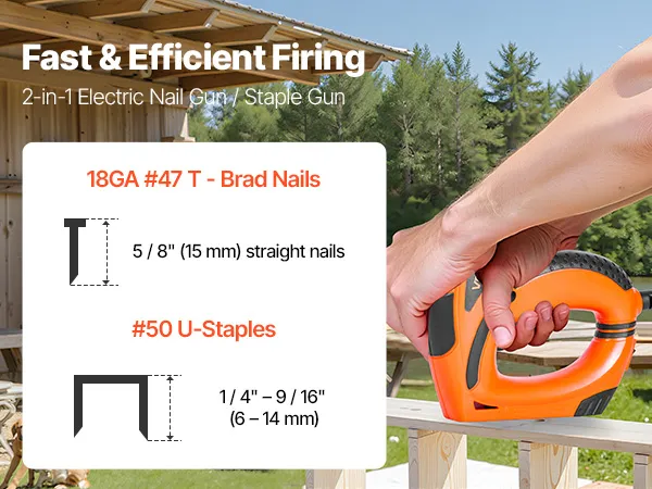 Zgodność 2 w 1: Ta elektryczna gwoździarka 2 w 1 pełni funkcję gwoździarki i zszywacza i obsługuje zszywki typu 18GA typu 47 T (5/8 cala / 15 mm) oraz zszywki typu 50 U (1/4 do 9/16 cala / 6 do 14 mm).