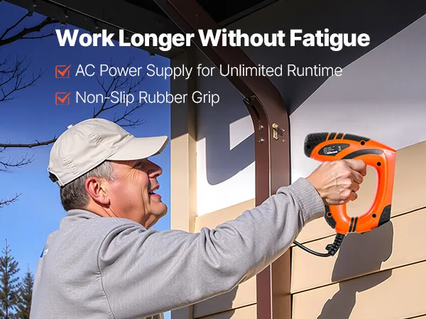 Stała wydajność: W przeciwieństwie do gwoździarki akumulatorowej, ta gwoździarka typu „podłącz i używaj” dostosowuje się do różnych warunków pracy. Zapewnia stałą prędkość wbijania, a lekka obudowa ułatwia transport, zmianę pozycji i przechowywanie.