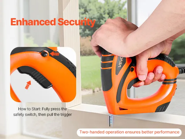 Wydajna praca: Napędzany silnikiem elektrycznym, zszywacz gwoździowy zapewnia stałą moc i prędkość do 30 gwoździ na minutę. Szybko wbija gwoździe i zszywki w drewno i podobne materiały, utrzymując stałą wydajność, aby zapobiec zakleszczaniu się lub wyginaniu łączników.