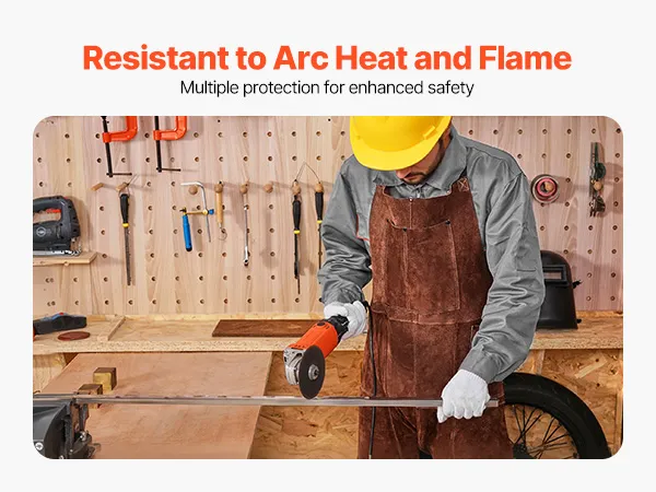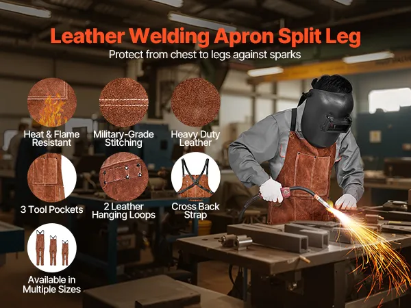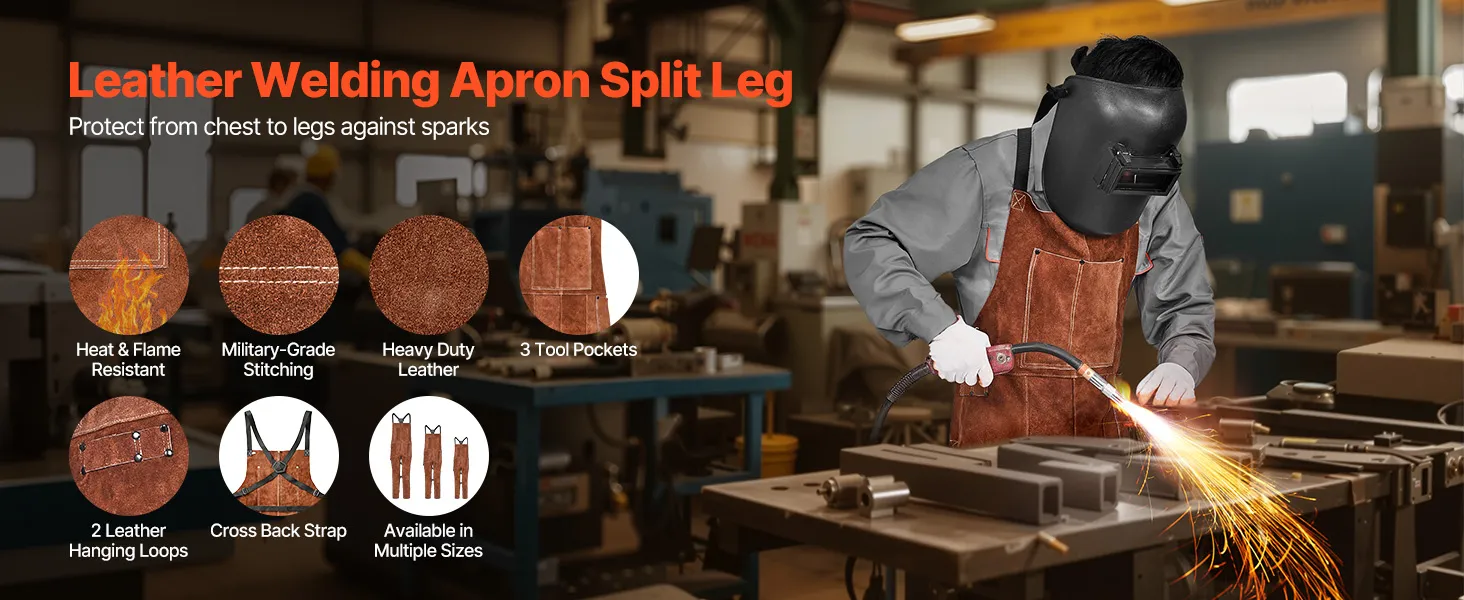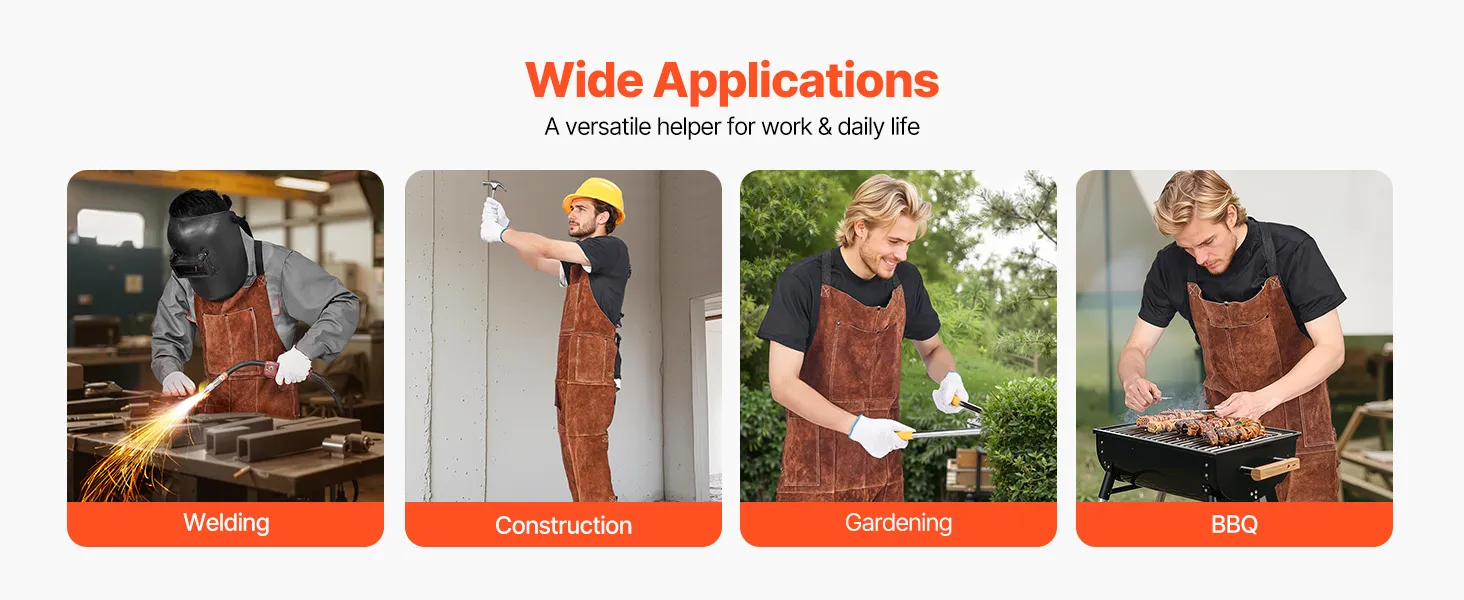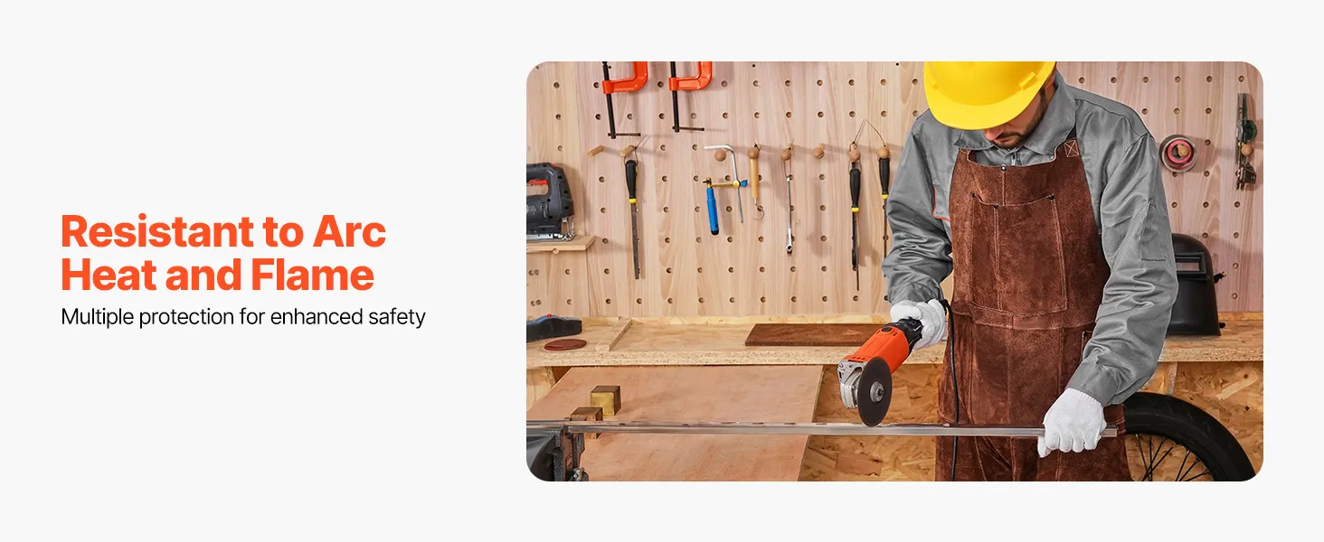 Wytrzymała skóra bydlęca: Wykonany z wytrzymałej pełnoziarnistej skóry bydlęcej i zszyty mocną, trudnopalną nicią Kevlar, fartuch spawalniczy VEVOR ma rozdzieloną część nogawkową, co zapewnia wysoką trwałość i niezawodną ochronę przed iskrami, płomieniami, ciepłem i zagrożeniami pożarowymi.