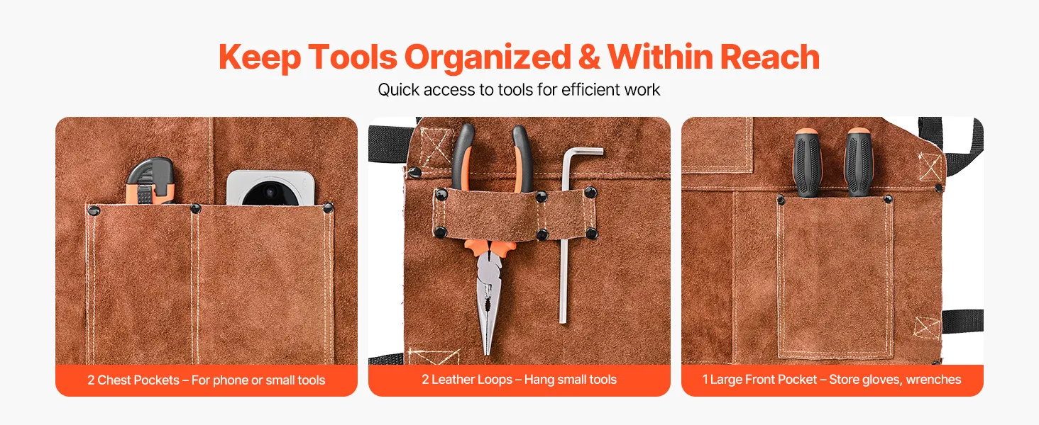 Pełna ochrona: Ten trudnopalny fartuch spawalniczy ma 610 mm szerokości i 1067 mm długości, zapewniając kompleksową ochronę od klatki piersiowej po nogi. Zapewnia doskonałą ochronę przed iskrami i wysoką temperaturą. Posiada trzy kieszenie i dwie skórzane szlufki do zawieszania narzędzi, telefonów komórkowych itp.