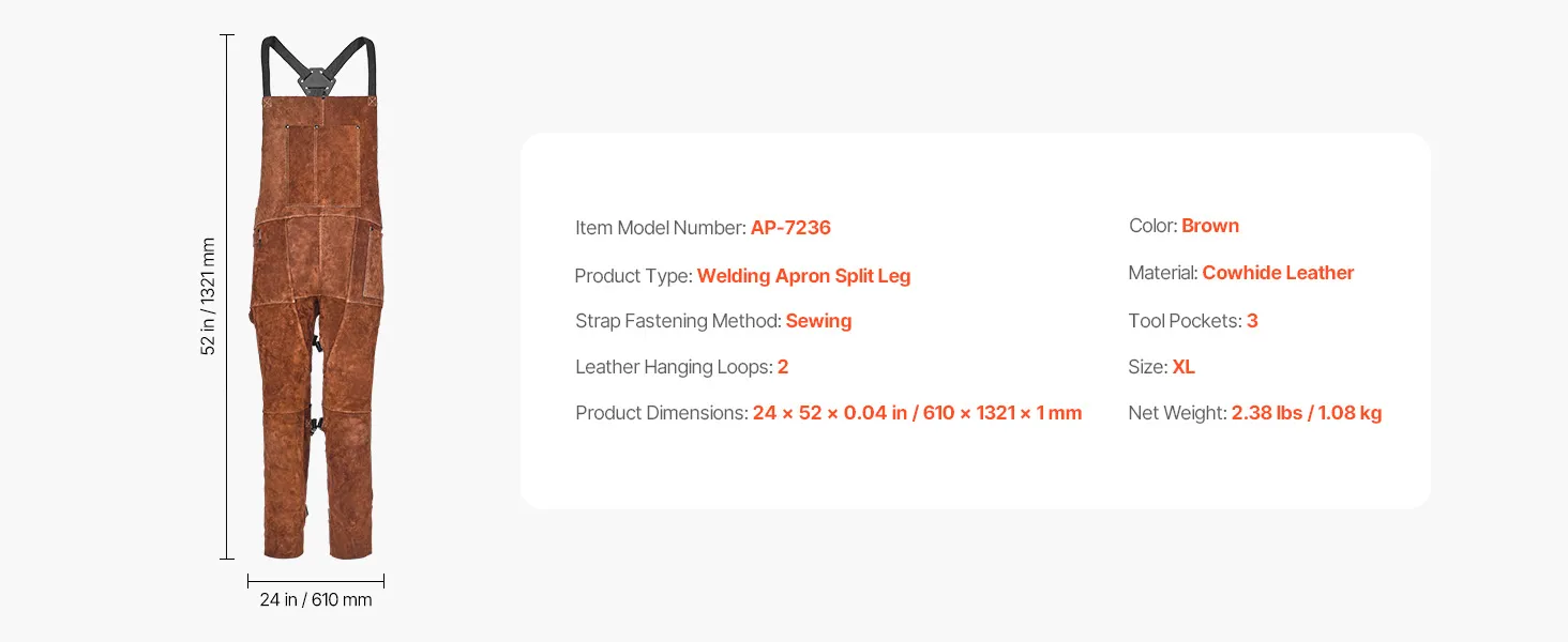 Fartuch spawalniczy VEVOR z rozciętymi nogawkami, fartuch ogrodniczy 610x1321 mm, fartuch roboczy ze skóry bydlęcej, odporny na ciepło, z 3 kieszeniami, do prac w drewnie, ogrodzie, kowalstwie, XL