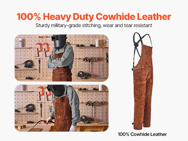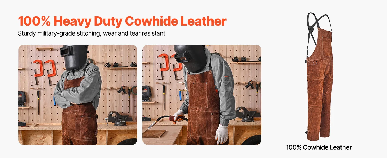 Wytrzymała skóra bydlęca: Wykonana z wytrzymałej pełnoziarnistej skóry bydlęcej i zszyta mocną, ognioodporną nicią Kevlar, rozdzielona część nogawkowa fartucha spawalniczego VEVOR zapewnia wysoką trwałość i niezawodną ochronę przed iskrami, płomieniami, ciepłem i zagrożeniami pożarowymi.