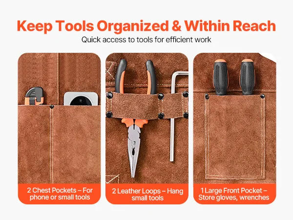 Pełna ochrona: Ten trudnopalny fartuch spawalniczy ma 610 mm szerokości i 1321 mm długości, zapewniając kompleksową ochronę od klatki piersiowej do nóg. Zapewnia doskonałą ochronę przed iskrami i ciepłem. Posiada trzy kieszenie i dwie skórzane szlufki do zawieszania narzędzi, telefonów komórkowych itp.