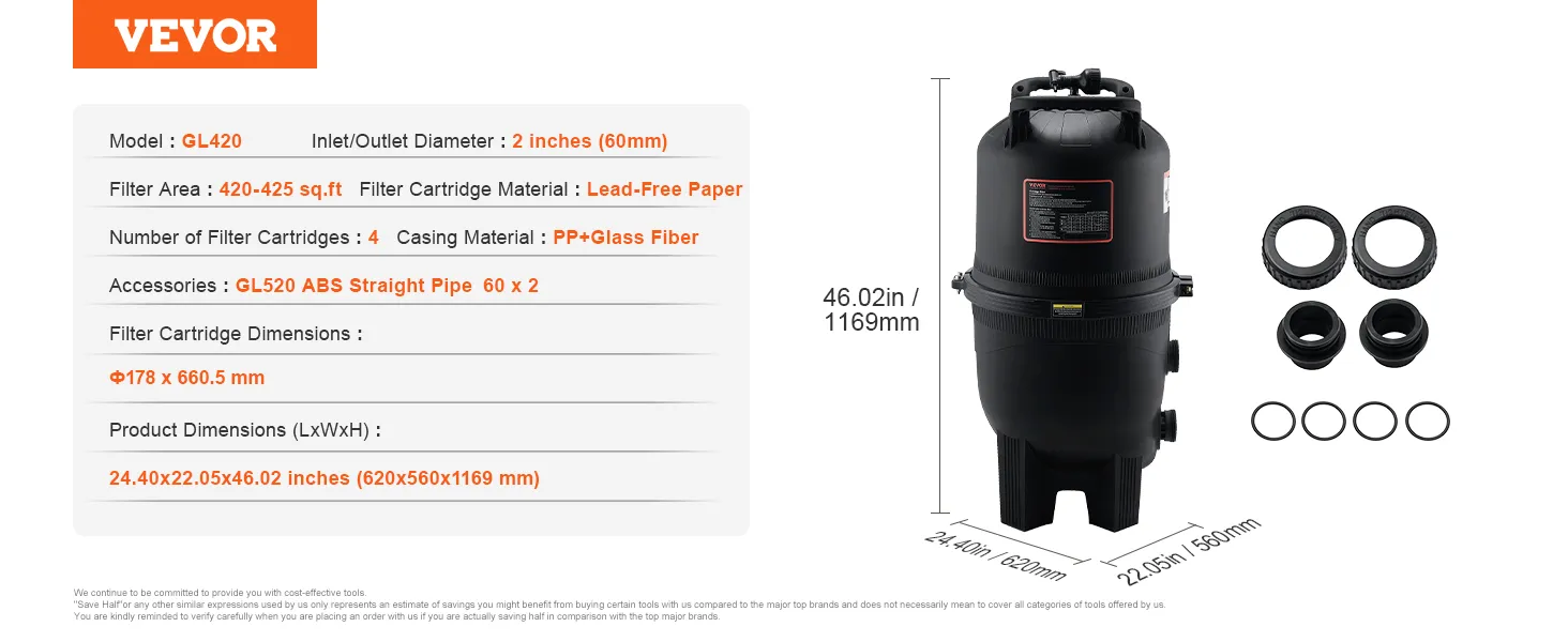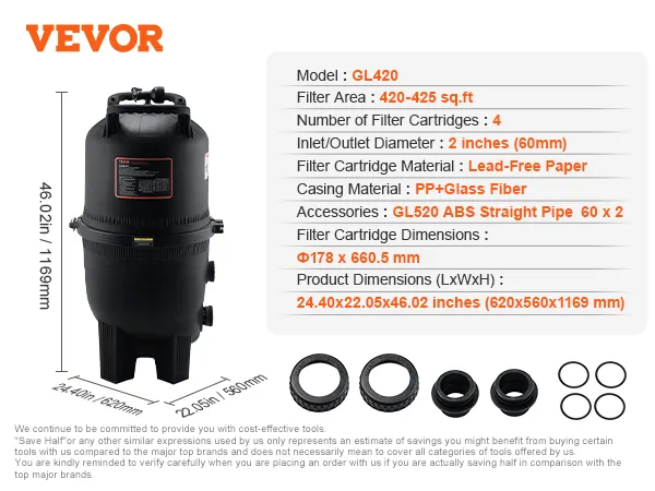 Filtr basenowy wkładowy VEVOR, 620 x 560 x 1169 mm, filtr do basenów naziemnych, system filtracji do basenów naziemnych z ulepszonym filtrem i szczelnością, do wanien z hydromasażem, jacuzzi, basenów dmuchanych
