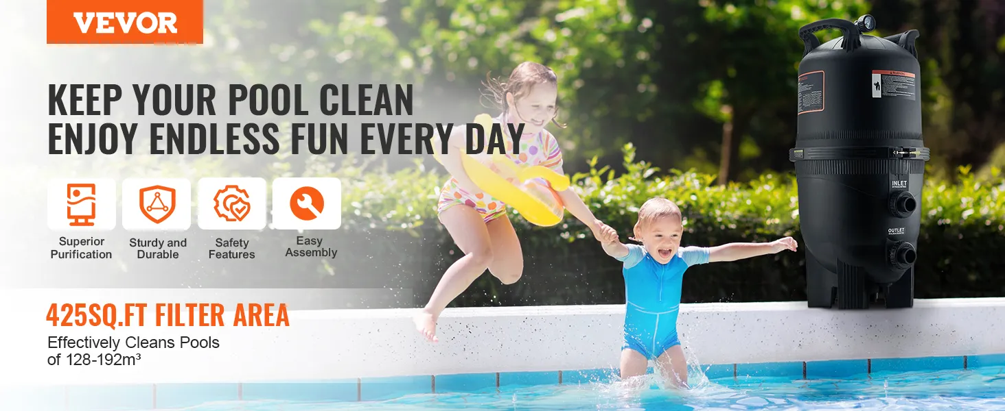 Powierzchnia filtracji 425 stóp kwadratowych: Nasz wydajny filtr z łatwością poradzi sobie z objętością wody w basenie od 128 do 192 metrów sześciennych, nadaje się do domów, hoteli i szkół, gwarantując niespotykaną czystość w Twoim basenie. Nasz filtr jest łatwy do czyszczenia i konserwacji, co pozwoli Ci zaoszczędzić mnóstwo czasu i wysiłku. Gwarantuje doskonałą jakość i bezpieczeństwo.