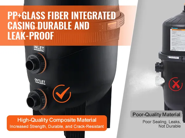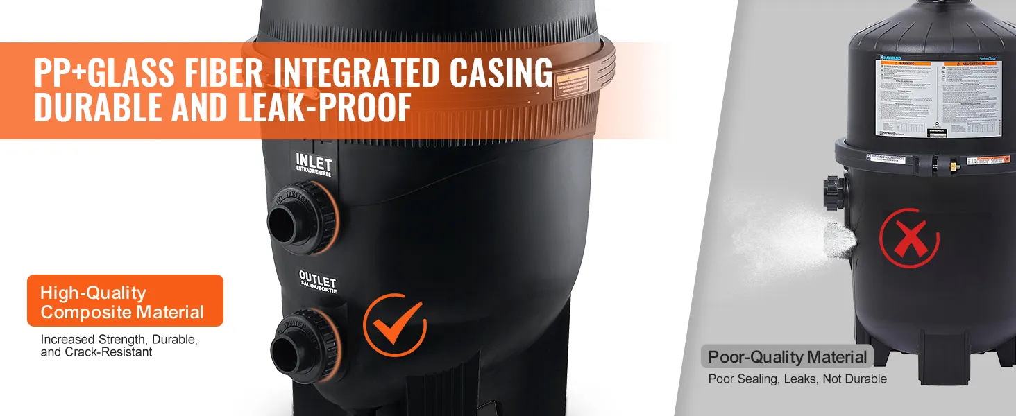 Wykonany z kompozytu PP i włókna szklanego w jednoczęściowej odlewanej konstrukcji, jest wytrzymały i trwały, a także skutecznie zapobiega przeciekom. Unikalna, bezszwowa konstrukcja nie tylko poprawia wygląd filtra, ale również wydłuża jego żywotność.