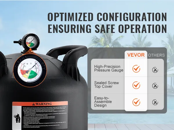 Urządzenie zawiera manometr umożliwiający łatwe monitorowanie ciśnienia oraz zamontowany na górze automatyczny zawór bezpieczeństwa zapobiegający eksplozjom. Dzięki temu zapewnia bezpieczne i wydajne rozwiązanie do czyszczenia basenu.