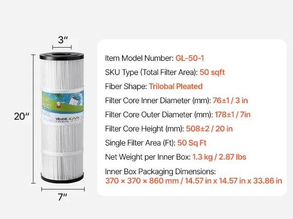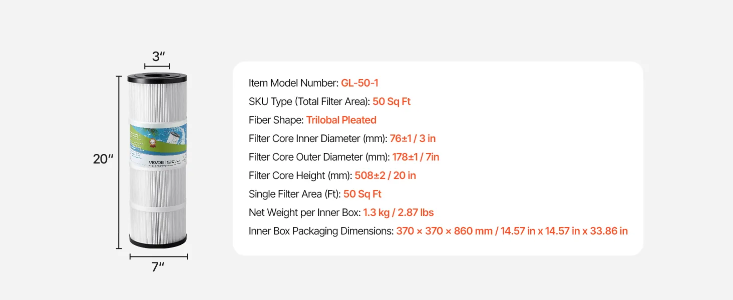 Dane techniczne produktu: Długość: 20 cali (508 mm). Średnica zewnętrzna: 7 cali (178 mm). Średnica wlotu/wylotu: 3 cale (ok. 76 mm). Powierzchnia filtra: 1 x 50 stóp kwadratowych (4,6 m²). Materiał filtra: Trilobal o wysokiej wydajności.