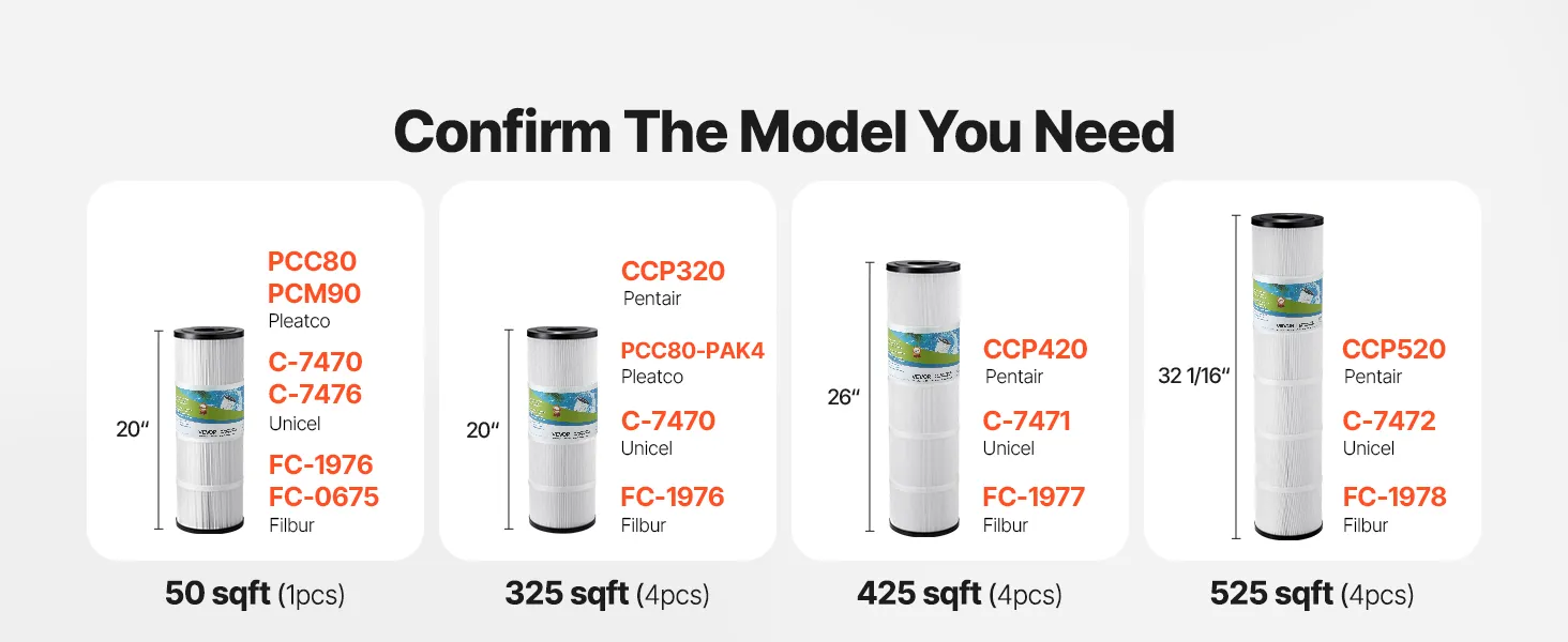 Zgodne modele zamienne: Wkład filtra basenowego GL-50-1 jest zgodny z następującymi modelami: VEVOR GL-50-1, Hayward C500, CX500-RE, Pleatco PA50, Ultral-A11, PP-A11, Unicel C-7656, Filbur FC-1240, FC-0625, FC-0620. Uwaga: To jest zgodne akcesorium innej firmy. Wymienione marki i modele są podane wyłącznie w celach informacyjnych. VEVOR jest niezależną marką.