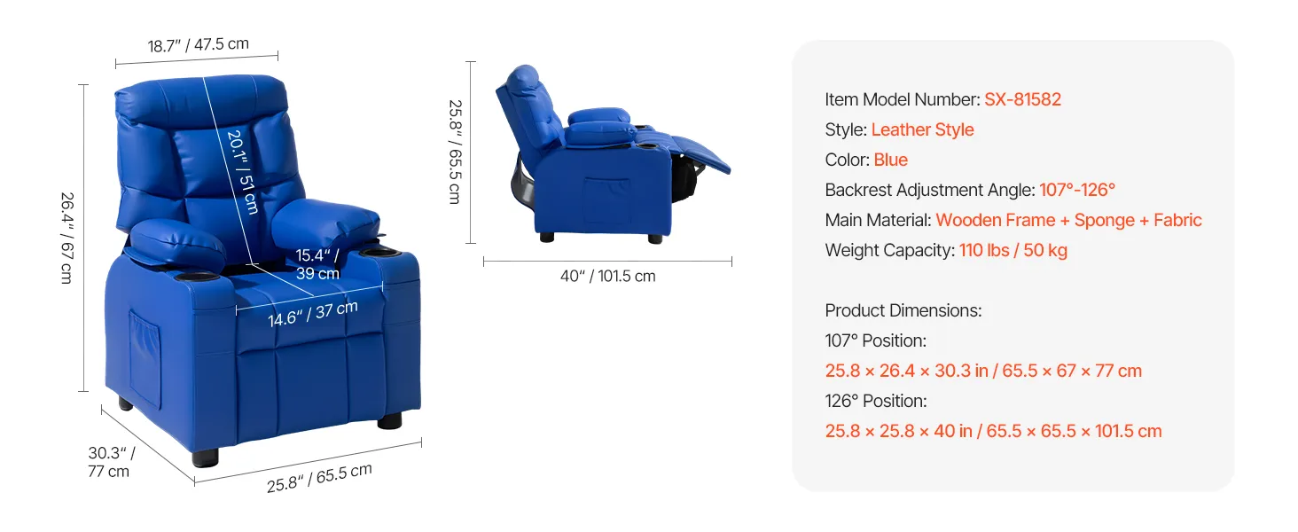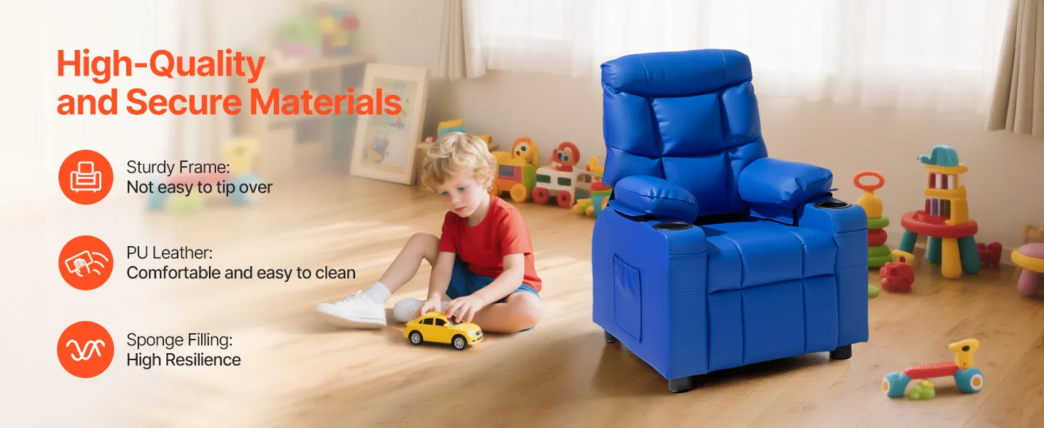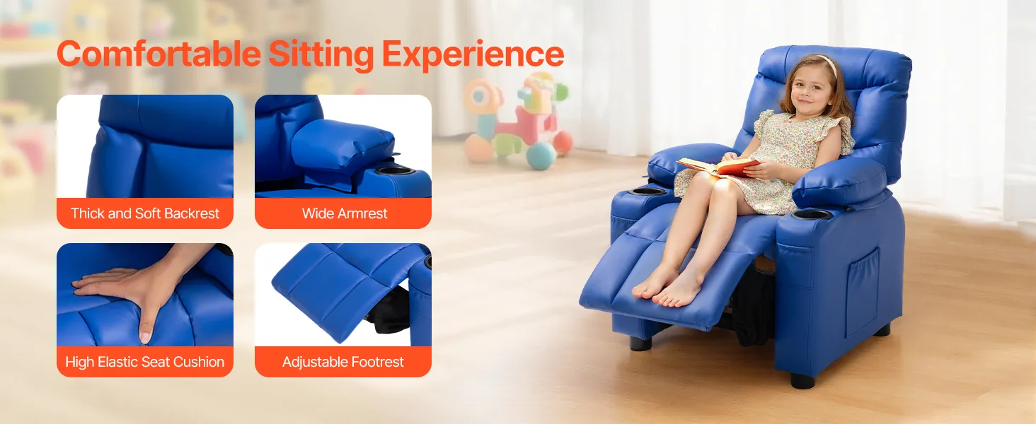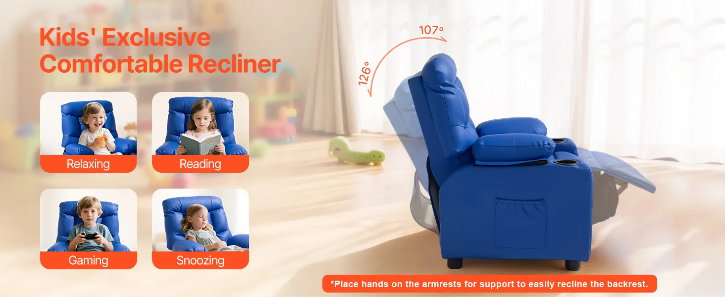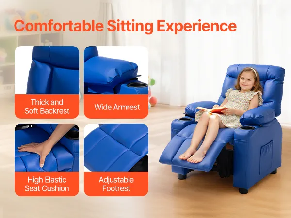 Fotel dziecięcy VEVOR z uchwytami na kubki, regulowany kąt oparcia 107° do 126°, rozkładana sofa ze skóry PU z podnóżkiem, nośność 50 kg dla chłopców i dziewcząt (niebieski)