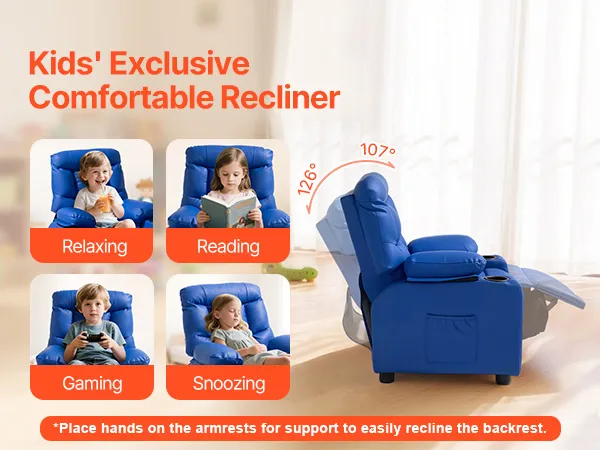 Regulowany fotel: Oparcie tego dziecięcego fotela można regulować w zakresie od 107° do 126°, co pozwala na wygodne siedzenie lub odchylenie, w zależności od potrzeb dziecka. Fotel ten służy zarówno jako sofa, jak i mini łóżko — idealne do czytania, oglądania telewizji, grania w gry lub relaksu. Uwaga: Proszę złożyć podnóżek, gdy nie jest używany.