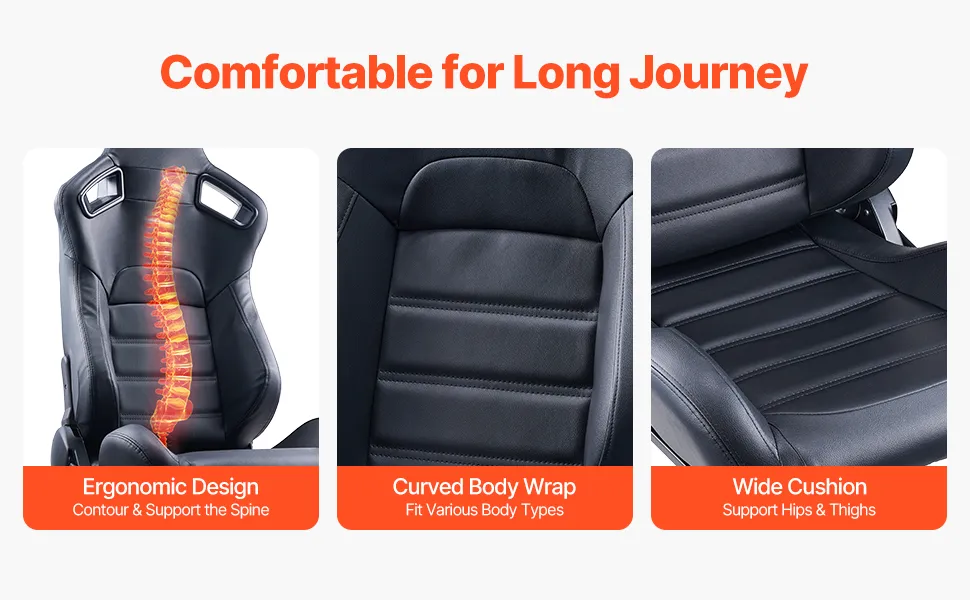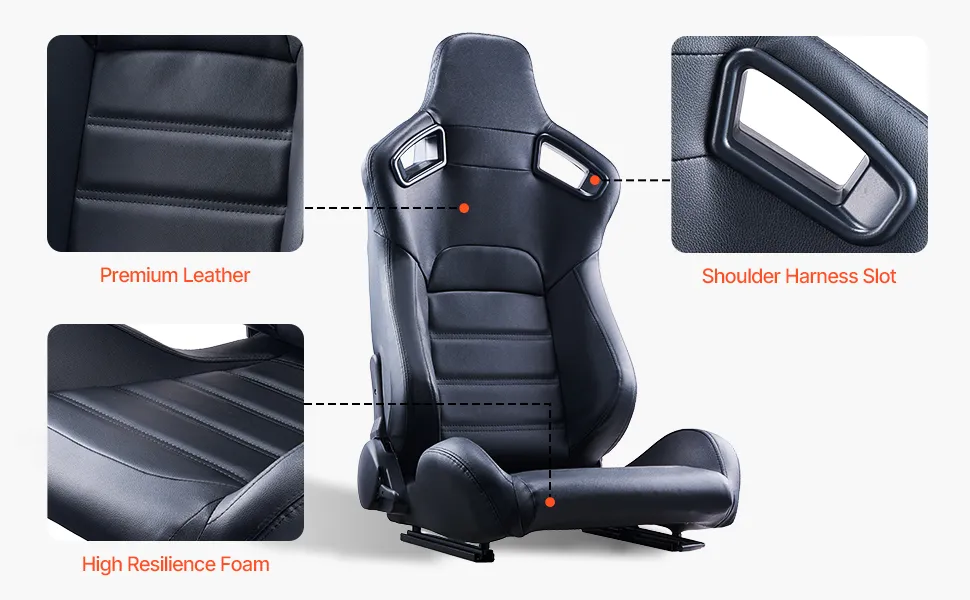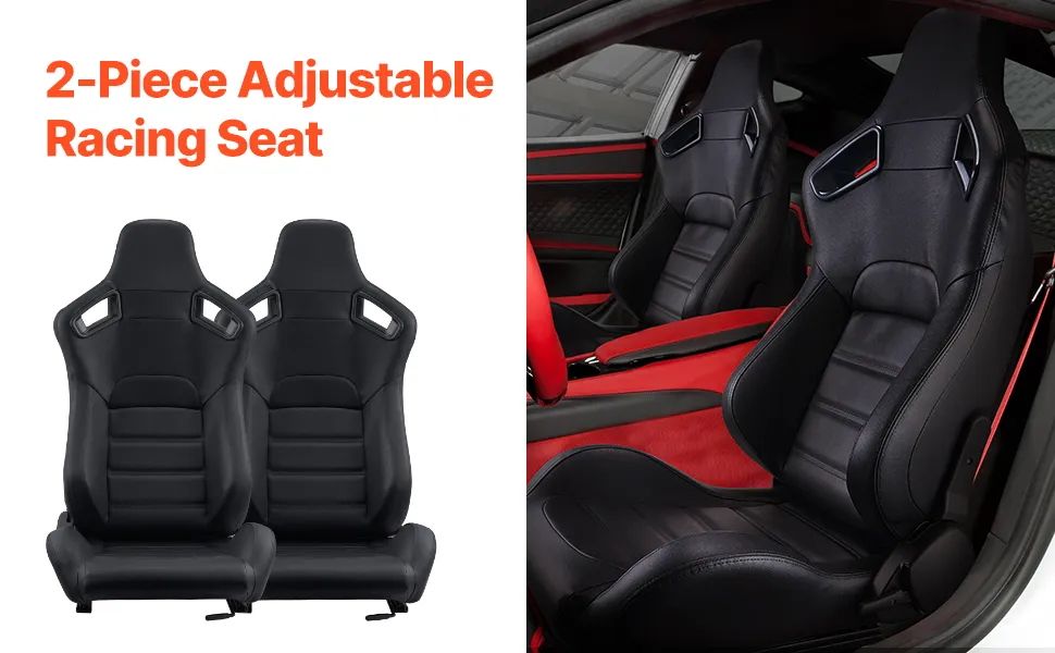 Fotel wyścigowy VEVOR Racing Cockpit z regulacją kąta nachylenia i pianką o wysokiej wytrzymałości, zestaw 2 szt., ze skórą PVC i suwakiem Q235B, do samochodów wyścigowych i gokartów (czarny / montowany z przodu)
