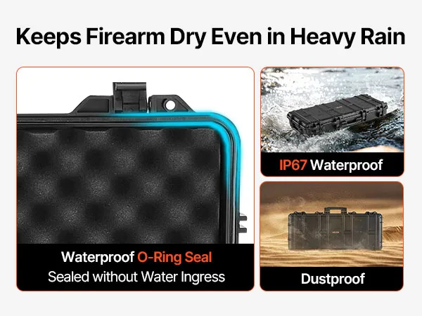 Wodoodporność i pyłoszczelność IP67: Ta wytrzymała obudowa na broń charakteryzuje się wytrzymałą, odporną na wstrząsy obudową i ochroną przed wodą i pyłem IP67, co zapewnia w pełni szczelną konstrukcję, która chroni broń przed wodą i trudnymi warunkami pogodowymi.