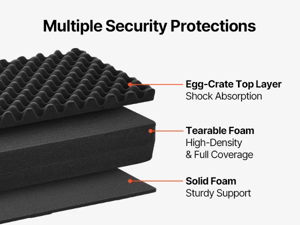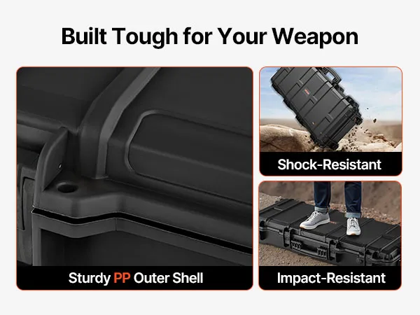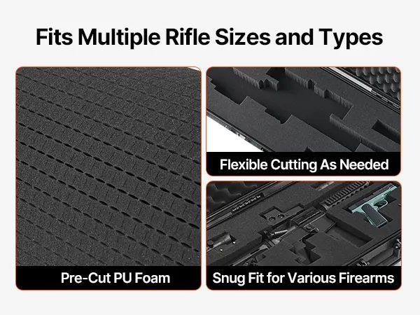 Pianka 4-warstwowa: Nasza walizka na broń wykonana jest z 4 warstw miękkiej pianki: 1 warstwy pianki egg-crate dla amortyzacji wstrząsów; 2 warstw pianki wstępnie przyciętej dla dokładnego dopasowania; oraz 1 warstwy twardej pianki dla dodatkowego wsparcia. Możesz dostosować przegrody do kształtu swojego karabinu.
