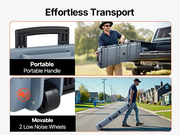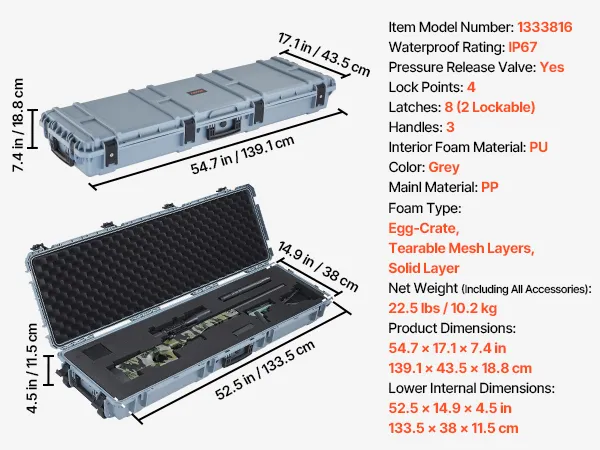 VEVOR Twardy futerał na broń długą, zamykany na klucz futerał na broń długą z wyciętymi piankami, zwijany futerał na broń długą, wodoodporny IP67, 1391 x 435 x 188 mm, szary