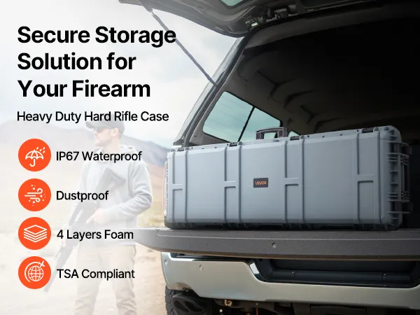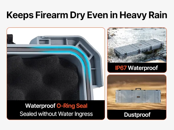 Wodoodporność i pyłoszczelność IP67: Ta wytrzymała obudowa na broń charakteryzuje się wytrzymałą, odporną na wstrząsy obudową i ochroną przed wodą i pyłem IP67, co zapewnia w pełni szczelną konstrukcję, która chroni broń przed wodą i trudnymi warunkami pogodowymi.