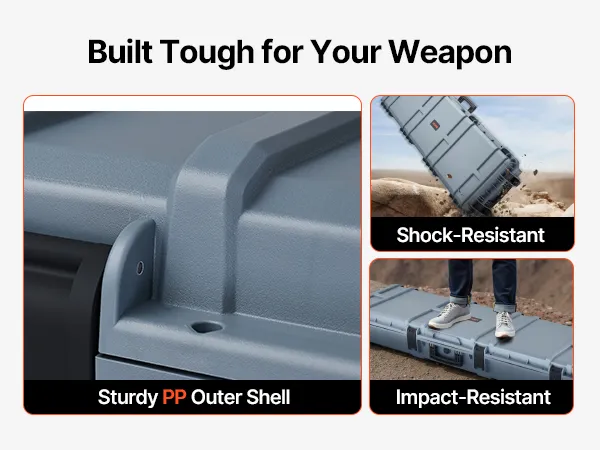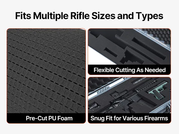 4-warstwowa pianka: Nasza walizka na broń długą wykonana jest z 4 warstw miękkiej pianki: 1 warstwy pianki egg-crate dla amortyzacji wstrząsów; 2 warstw wstępnie wyciętej pianki dla dokładnego dopasowania; oraz 1 warstwy twardej pianki dla dodatkowego wsparcia. Możesz dostosować przegrody do kształtu swojego karabinu.
