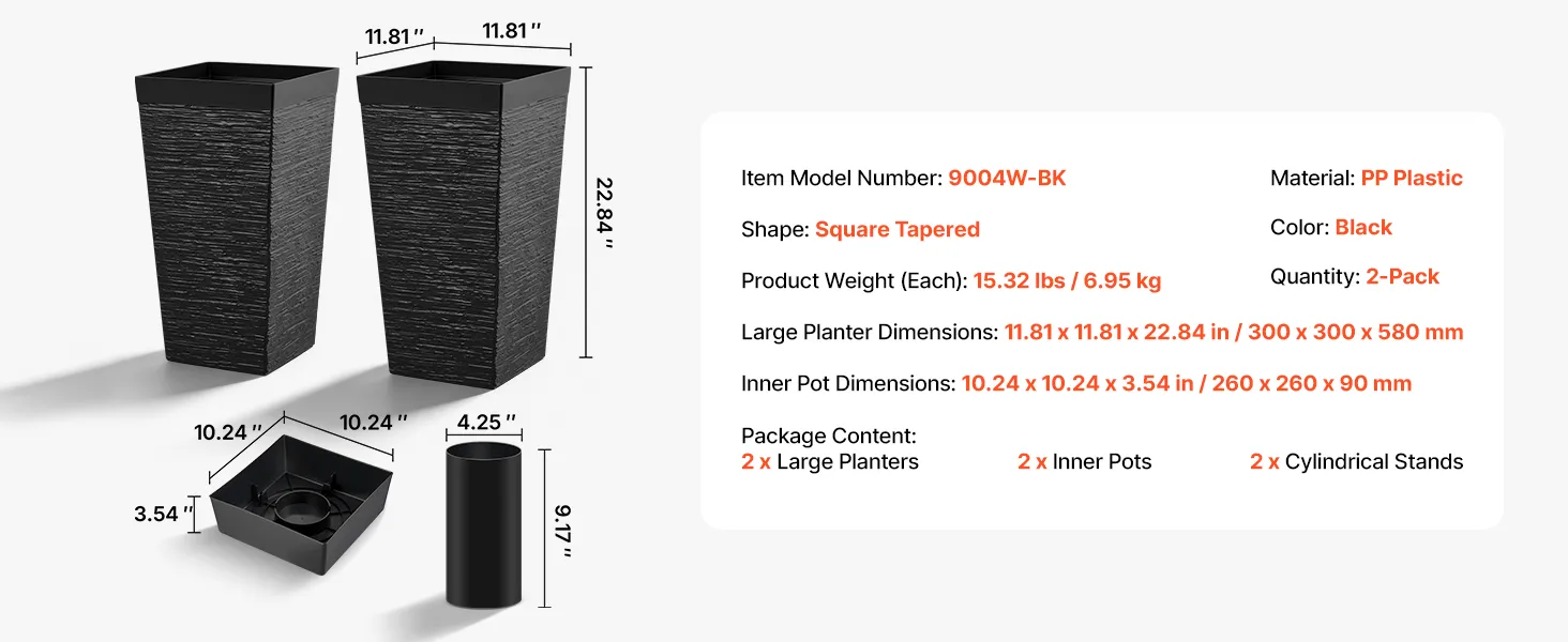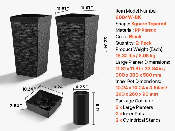 Doniczka VEVOR 300x300x580 mm, 2 sztuki, doniczka, pojemnik na rośliny z PP, skrzynka na rośliny z doniczką wewnętrzną i otworami drenażowymi, odpowiednia do roślin domowych i ogrodowych, czarna
