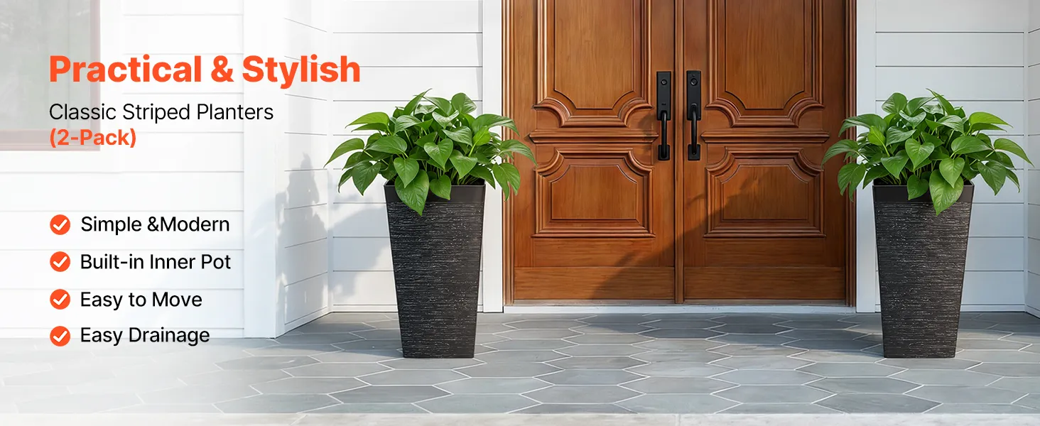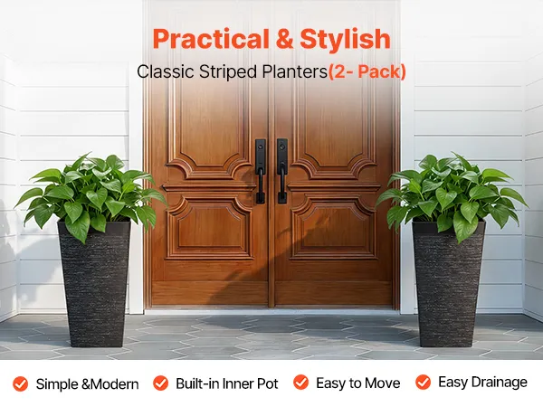 • Czysty i nowoczesny design: Dzięki eleganckim, zwężanym liniom i ponadczasowemu wzorowi w paski, te wysokie donice ogrodowe idealnie wpasują się w każde otoczenie – od nowoczesnego po tradycyjne. Niezależnie od tego, czy wewnątrz, czy na zewnątrz, dodadzą Twojemu domowi elegancji.