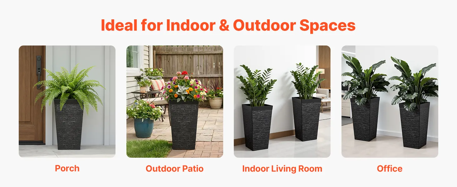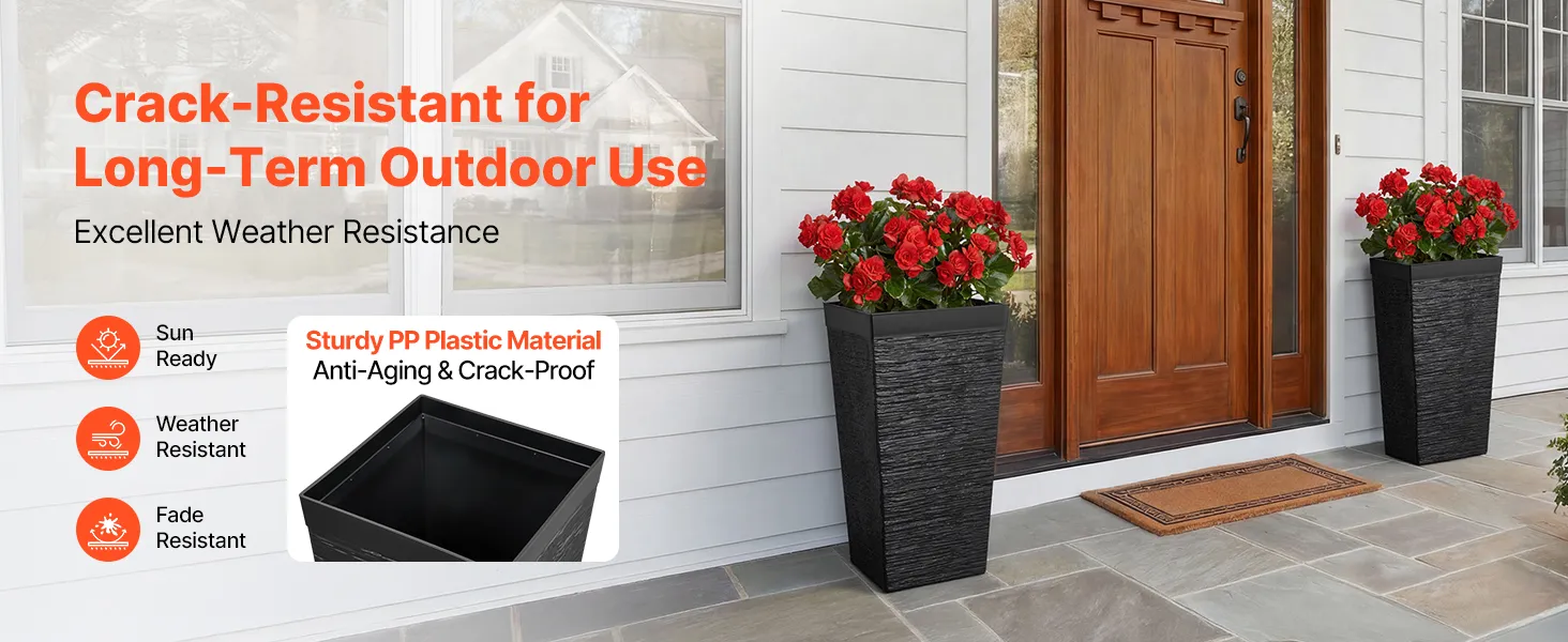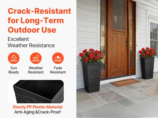 • Wysoka odporność na warunki atmosferyczne: Te wysokie donice, wykonane z wysokiej jakości, odpornego na warunki atmosferyczne tworzywa sztucznego, są odporne na pęknięcia i odbarwienia oraz zapewniają stabilność w słońcu, deszczu i śniegu. Idealne do użytku wewnątrz i na zewnątrz.