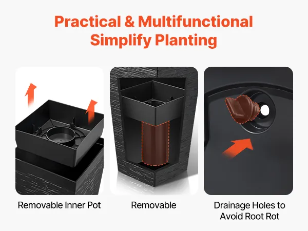 • Łatwe sadzenie: Nasze wysokie donice na patio lub werandę posiadają praktyczne donice wewnętrzne, które nadają się zarówno do roślin doniczkowych, jak i gruntowych. Ruchomy, cylindryczny stojak zapewnia stabilne podparcie i ułatwia sadzenie, czyniąc je czystszymi.