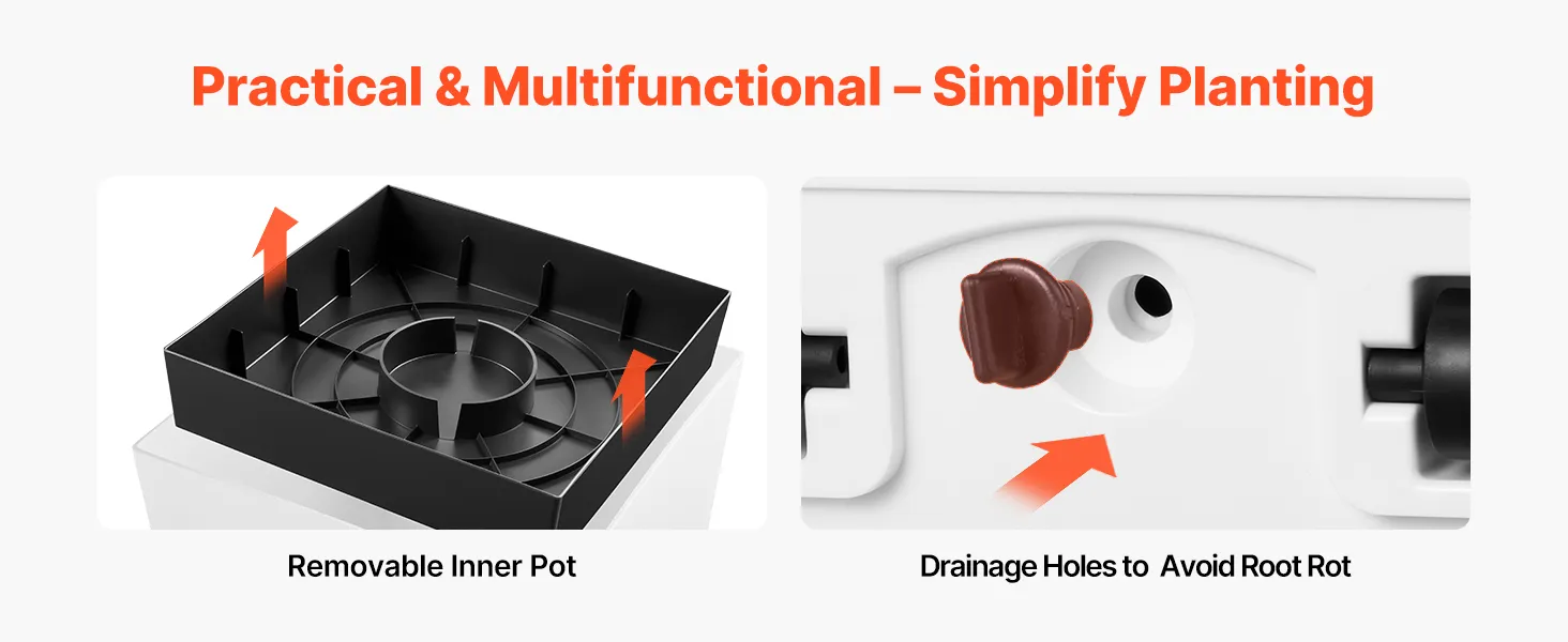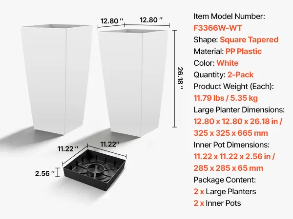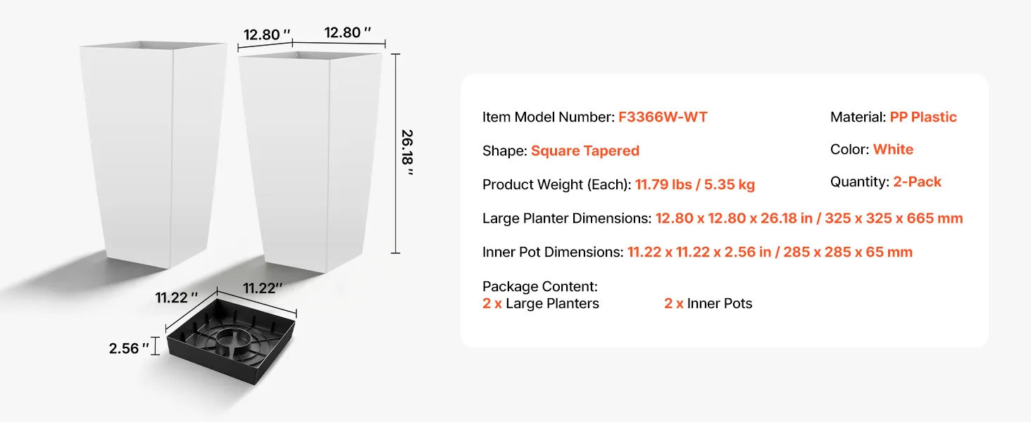 Doniczka VEVOR 325x325x665 mm, zestaw 2-częściowy, doniczka, doniczka, pojemnik na rośliny PP, skrzynka na rośliny z doniczką wewnętrzną i otworami drenażowymi, odpowiednia do roślin domowych i ogrodowych, biała