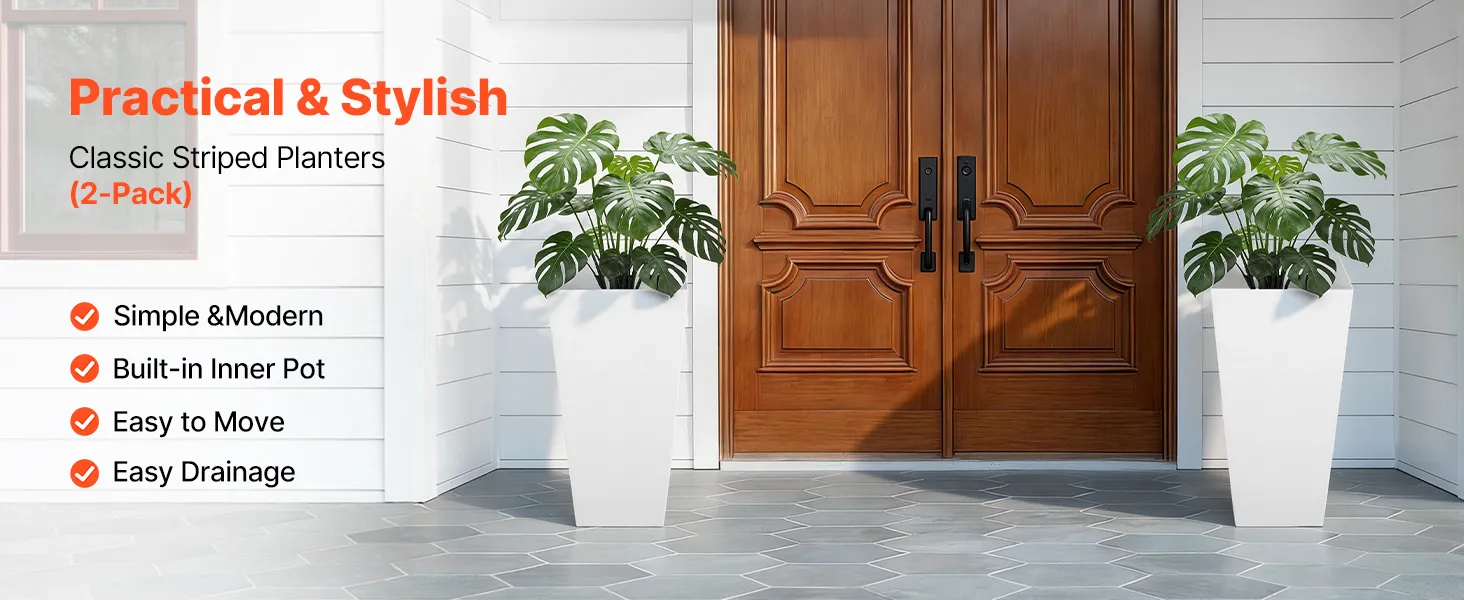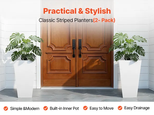 • Czysty i nowoczesny design: Dzięki eleganckim, zwężanym liniom i ponadczasowemu wzorowi w paski, te wysokie donice ogrodowe idealnie wpasują się w każde otoczenie – od nowoczesnego po tradycyjne. Niezależnie od tego, czy wewnątrz, czy na zewnątrz, dodadzą Twojemu domowi elegancji.