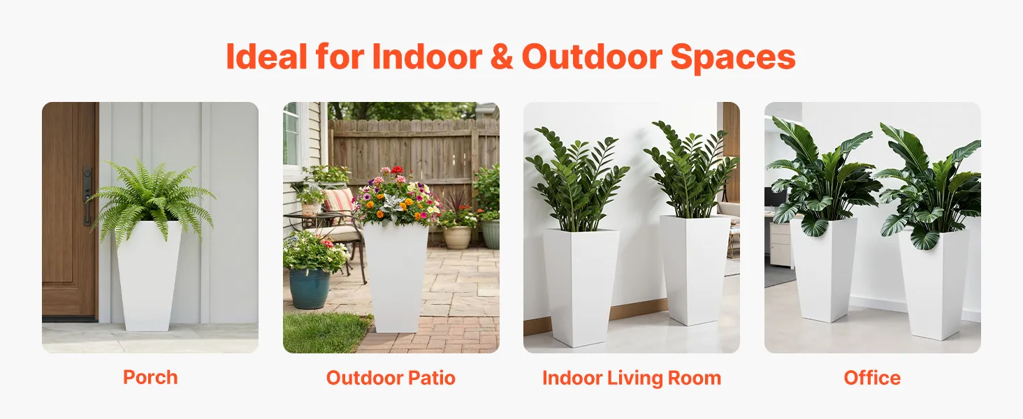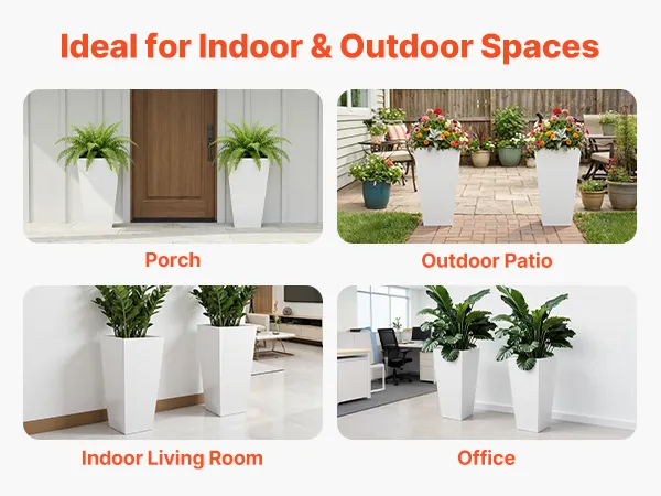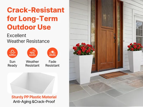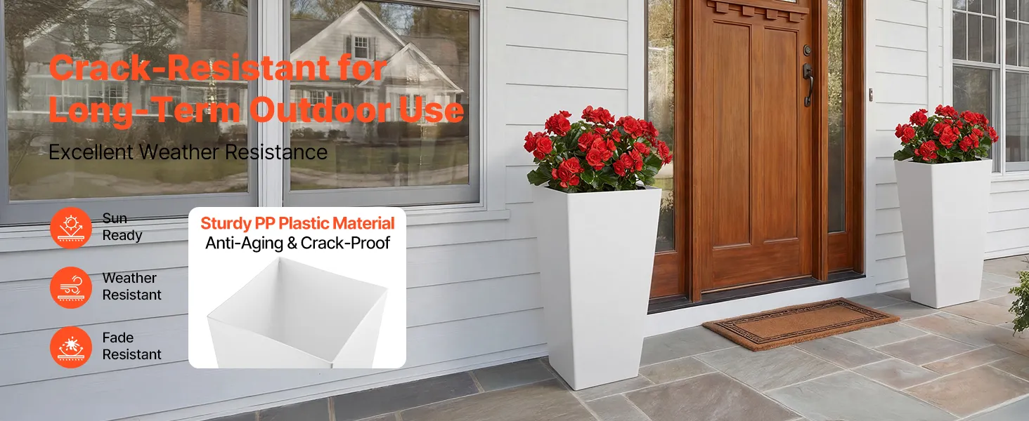 • Wysoka odporność na warunki atmosferyczne: Te wysokie donice, wykonane z wysokiej jakości, odpornego na warunki atmosferyczne tworzywa sztucznego, są odporne na pęknięcia i odbarwienia oraz zapewniają stabilność w słońcu, deszczu i śniegu. Idealne do użytku wewnątrz i na zewnątrz.