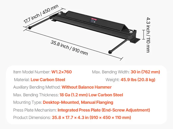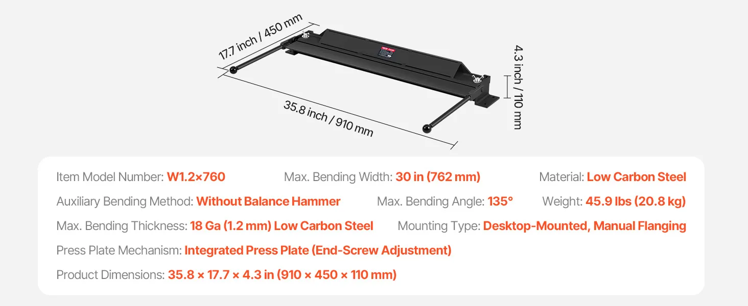 Giętarka VEVOR, giętarka do blachy 762 mm, grubość gięcia 1,2 mm, regulacja w zakresie 0–135 stopni, giętarka do metalu, bez drgań, wytrzymały sprzęt do gięcia aluminium do precyzyjnego gięcia w stosach
