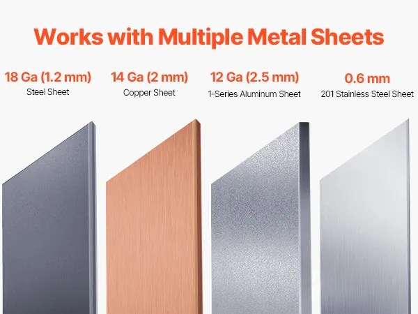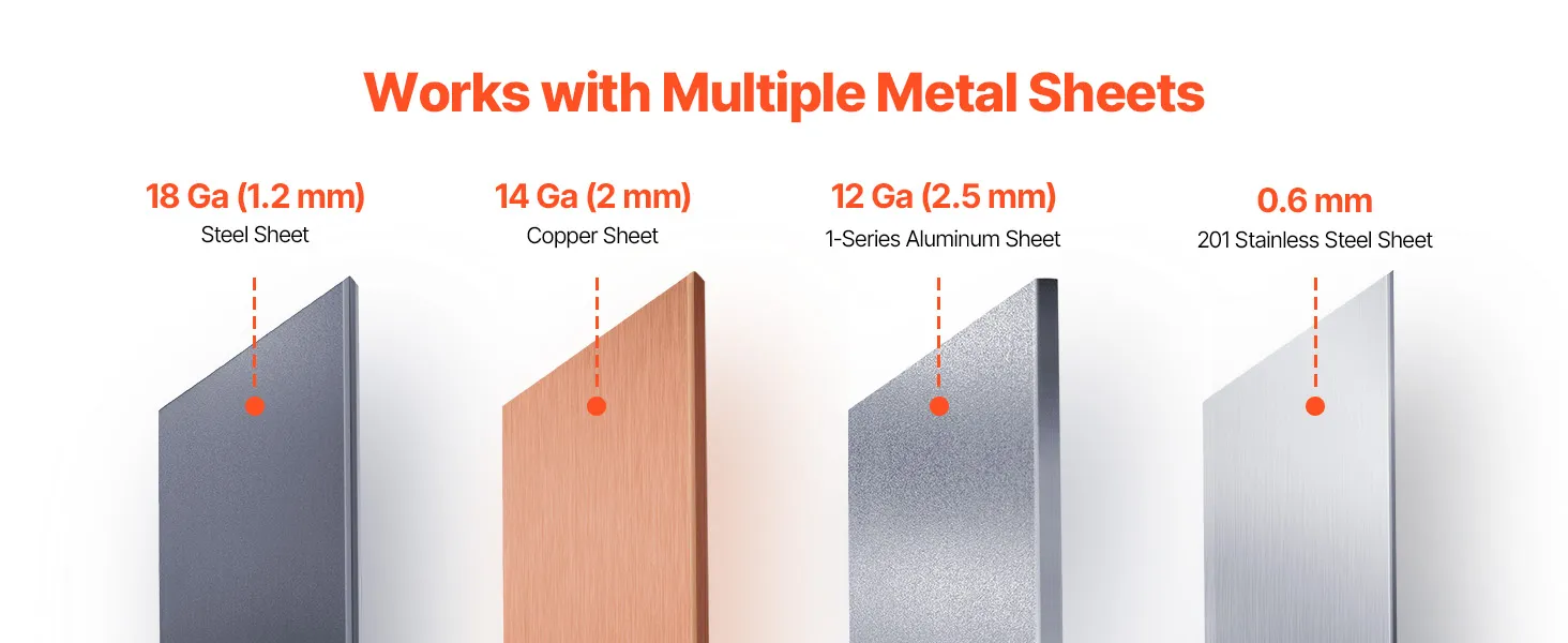 Do różnych materiałów i grubości: Nasza giętarka ramowa jest kompatybilna ze stalą miękką, stalą nierdzewną, miedzią i aluminium. Giętarka do metalu z łatwością gnie stal miękką o grubości 1,2 mm (18 gauge) dzięki ostrzu o grubości 0,3 cala (7,62 mm), które zapewnia ostre i czyste gięcie.