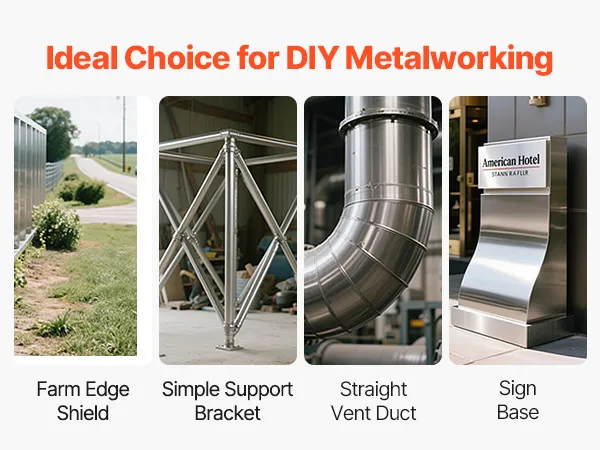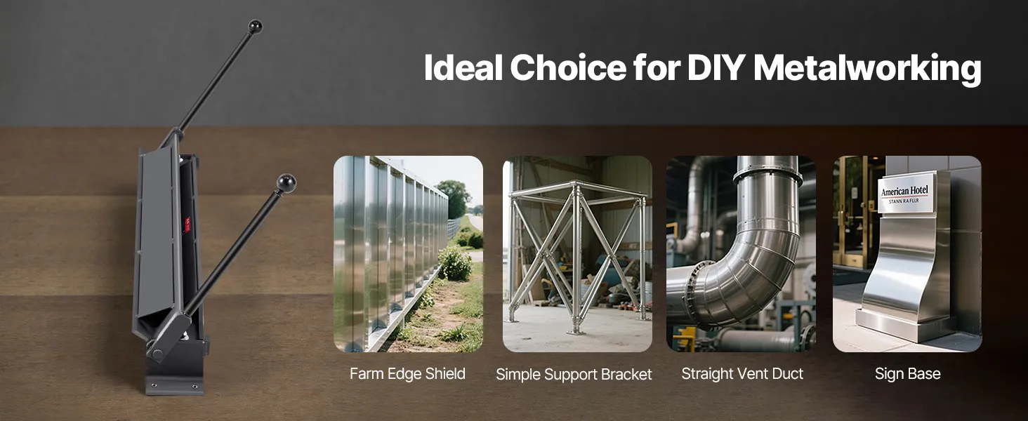 Chociaż giętarka do blachy nie obsługuje gięcia skrzynkowego, idealnie nadaje się do produkcji elementów o prostych krawędziach, takich jak osłony ciągników, proste wsporniki, proste kanały wentylacyjne i podstawy znaków. Nadaje się do użytku warsztatowego i prostych projektów obróbki blachy.