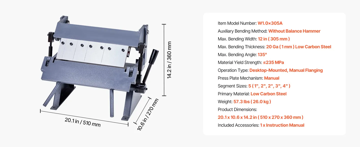 Giętarka VEVOR, prasa krawędziowa 305 mm, grubość gięcia stali miękkiej 1 mm, regulacja 0-135 stopni, giętarka do blachy, giętarka obrotowa 5-palcowa, giętarka do blachy do precyzyjnego gięcia