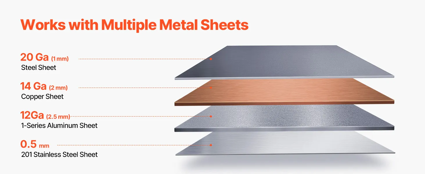 Zakres gięcia 12 cali (305 mm): Ta kompaktowa giętarka do blachy wygina arkusze metalu o szerokości do 12 cali (305 mm) pod kątem od 0° do 135°, dzięki czemu idealnie nadaje się do mniejszych projektów DIY i zastosowań w warsztatach.