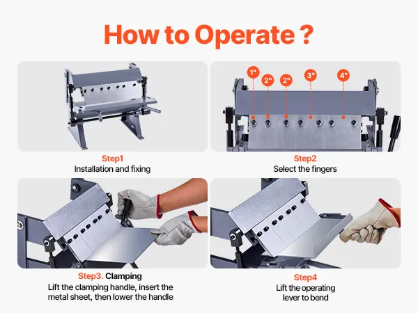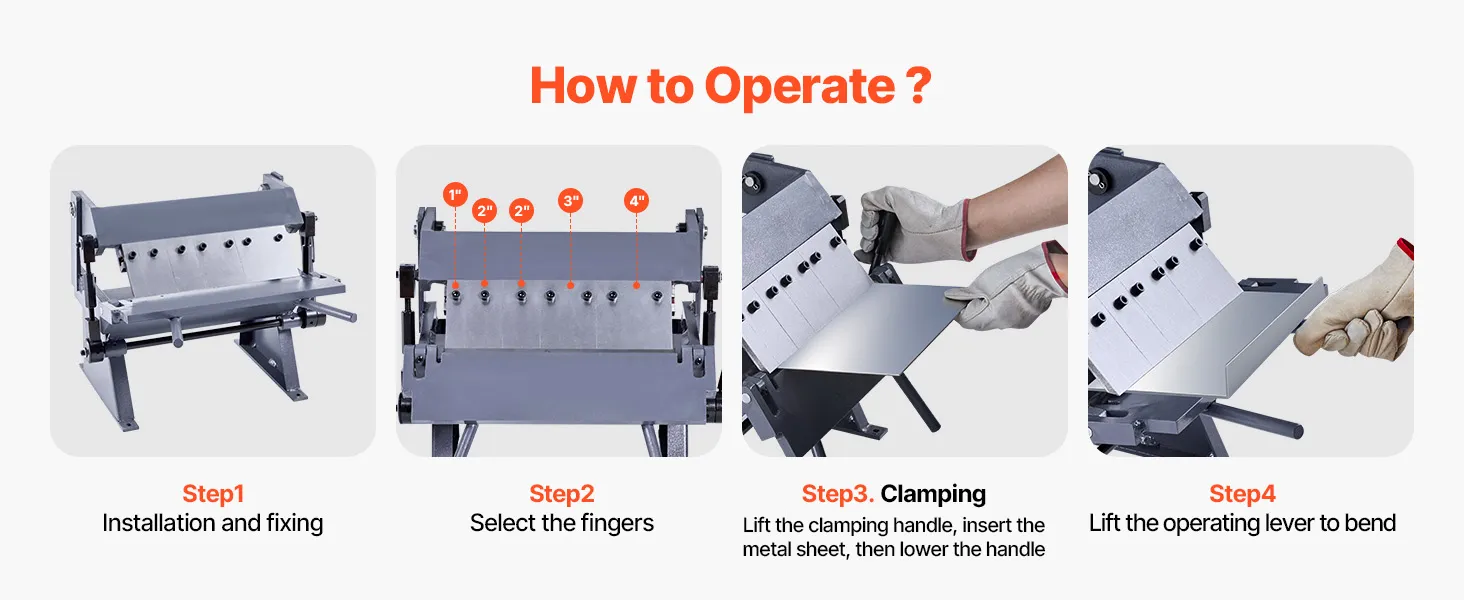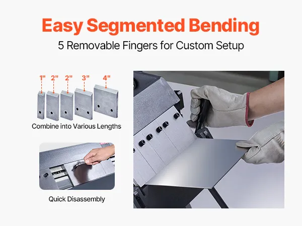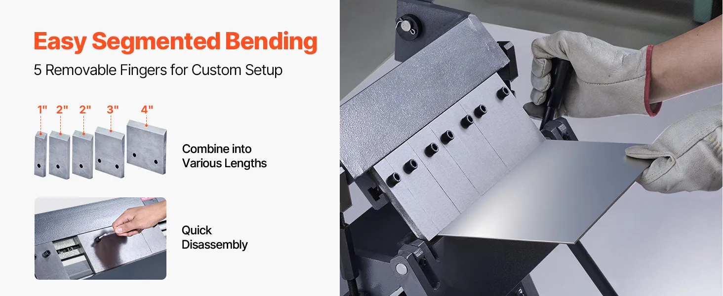 Konstrukcja segmentowa palców: Giętarka do blachy posiada pięć segmentowych palców (1 cal (2,54 cm), 2 cale (5,08 cm), 2 cale (5,08 cm), 3 cale (7,62 cm) i 4 cale (10,16 cm), które można dowolnie rozmieszczać, co zapewnia elastyczność gięcia. Idealna do formowania paneli bocznych, kołnierzy i konstrukcji skrzynkowych do szaf elektrycznych, obudów i rurociągów.