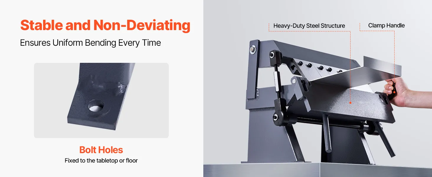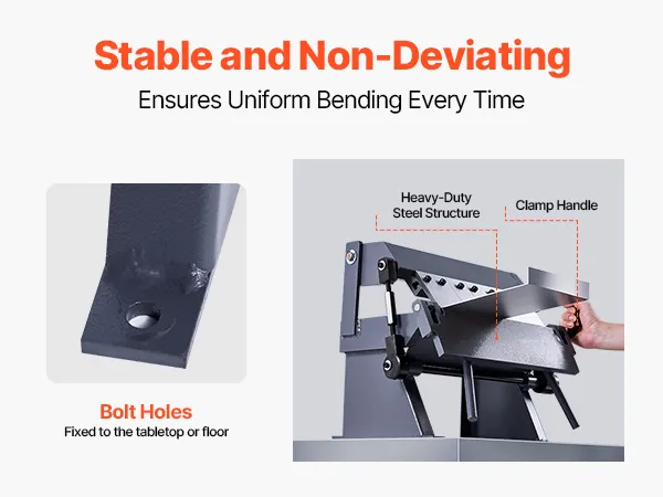 Pewny chwyt: Giętarka do metalu posiada wstępnie nawiercone otwory montażowe w podstawie, które umożliwiają przymocowanie hamulca do stołu warsztatowego lub podłogi za pomocą śrub. Zapobiega to ślizganiu się narzędzia podczas użytkowania, zapewniając bardziej precyzyjne gięcie bez użycia rąk.