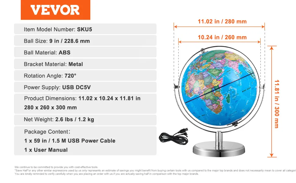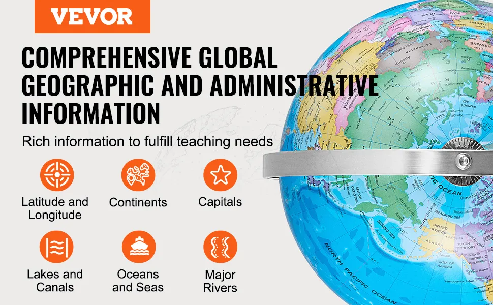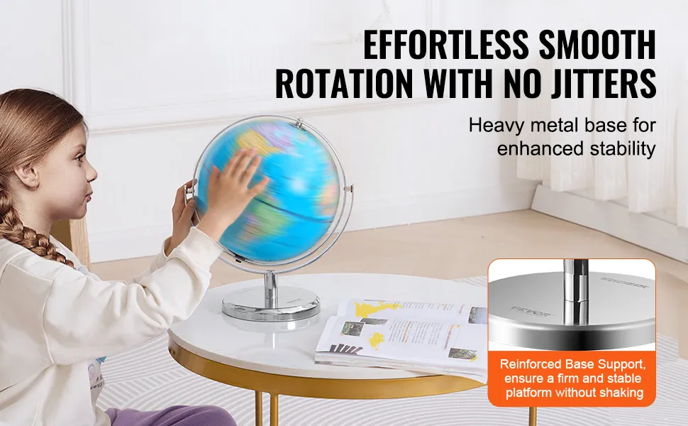 Podświetlany globus VEVOR jest zbudowany tak, aby służył długo. Posiada stabilną, ciężką metalową podstawę, która utrzymuje globus na miejscu. Ta podstawa jest wytrzymała i dobrze wykonana, zapewniając solidne bezpieczeństwo obracającemu się globusowi. Sama podstawa jest zaprojektowana tak, aby była lekka, ale stabilna. Dzięki temu można łatwo przesuwać globus bez narażania jego stabilności. Połączenie tego materiału i materiału AB Ball gwarantuje trwałość i długotrwałe użytkowanie. Dlatego możesz zaufać jej zarówno w domu, jak i w klasie.