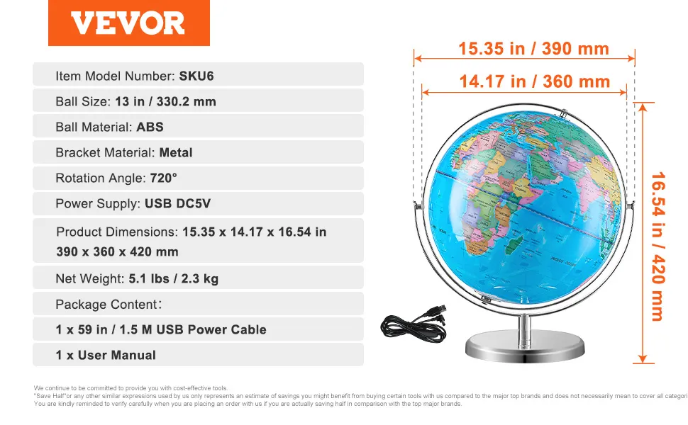 Ten globus został zbudowany tak, aby służył przez lata. Posiada mocną kulę ABs i zabezpieczającą metalową podstawę. Wysokiej jakości materiały zapewniają, że wytrzyma regularne użytkowanie. Podstawa jest lekka, ale stabilna, co zapobiega jej przewróceniu. Globus obraca się płynnie, co zwiększa jego funkcjonalność. Wyraźny nadruk i żywe kolory pozostają nienaruszone przez długi czas. Ta trwałość sprawia, że jest to niezawodne narzędzie edukacyjne na wiele lat. Rodzice i nauczyciele mogą być pewni, że ten globus pomoże Ci zapamiętać naukę.