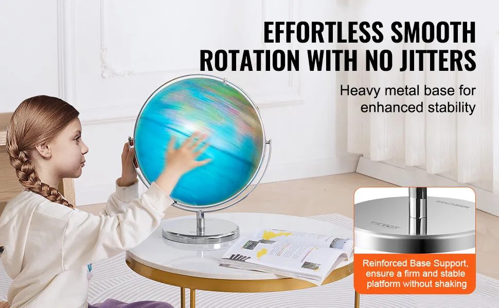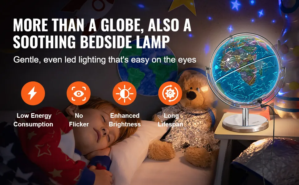 Podświetlany globus świata VEVOR zamienia się w magiczne światło nocne. Gdy światło gaśnie, glob rozświetla się, odsłaniając konstelacje. Ta funkcja sprawia, że jest to idealny dodatek do pokoju każdego dziecka. Pomaga stworzyć interesujące środowisko edukacyjne w nocy. Dzieci mogą z łatwością odkrywać gwiazdy i uczyć się o konstelacjach. Wyraźne, wyraźne linie i napisy ułatwiają czytanie w ciemności. Ta wyjątkowa funkcja wzbogaca naukę i jest zabawna i interaktywna dla dzieci. Może pobudzić zainteresowanie, jeśli dziecko lubi astronomię i geografię. Wartość edukacyjna Ziemi świeci najjaśniej podczas tych nocnych sesji.