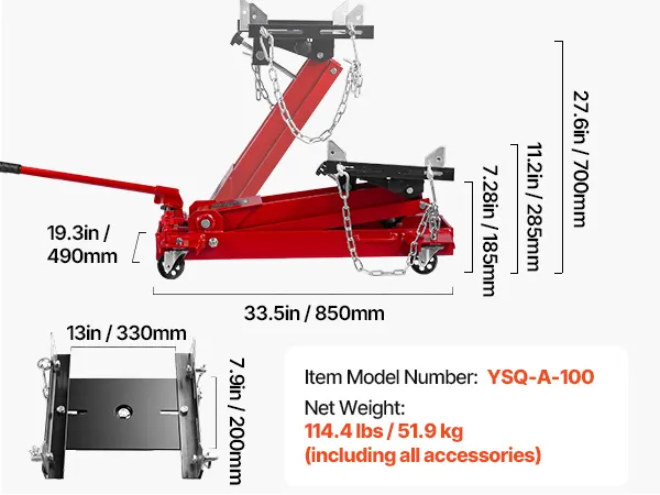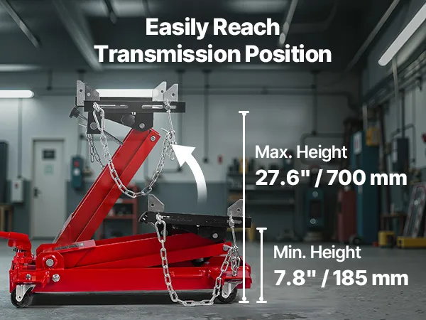 Niska konstrukcja: Nasz podnośnik wózkowy oferuje zakres podnoszenia od 7,28 do 27,6 cala (185–700 mm). Jego wyjątkowo niska wysokość pasuje do różnych pojazdów i umożliwia łatwe wsuwanie, nawet przy obciążeniu skrzyni biegów. Uwaga: Przed użyciem należy podeprzeć pojazd podstawkami pod podnośnik.