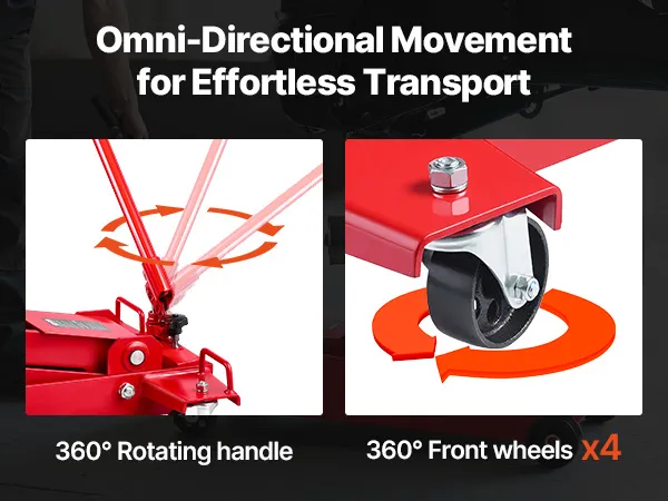 Wydajna praca hydrauliczna: Ten podnośnik hydrauliczny jest wyposażony w uchwyt pompy, który zapewnia płynniejsze i łatwiejsze podnoszenie. Obrotowy uchwyt 360° umożliwia łatwe pompowanie pod dowolnym kątem, a zawór zwrotny zapewnia kontrolowane, powolne opuszczanie, zmniejszając ryzyko nagłego upadku.