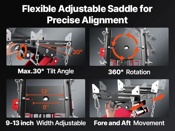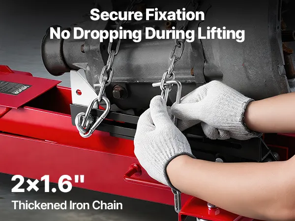 Regulowana taca: Tacę podnośnika hydraulicznego można obracać o 360°, regulować jej szerokość i pochylać do 30°. Zapewnia to precyzyjne ustawienie podczas montażu skrzyni biegów. Do zabezpieczenia części przed wypadnięciem należy użyć łańcuchów. Zwiększa to dokładność i bezpieczeństwo naprawy.