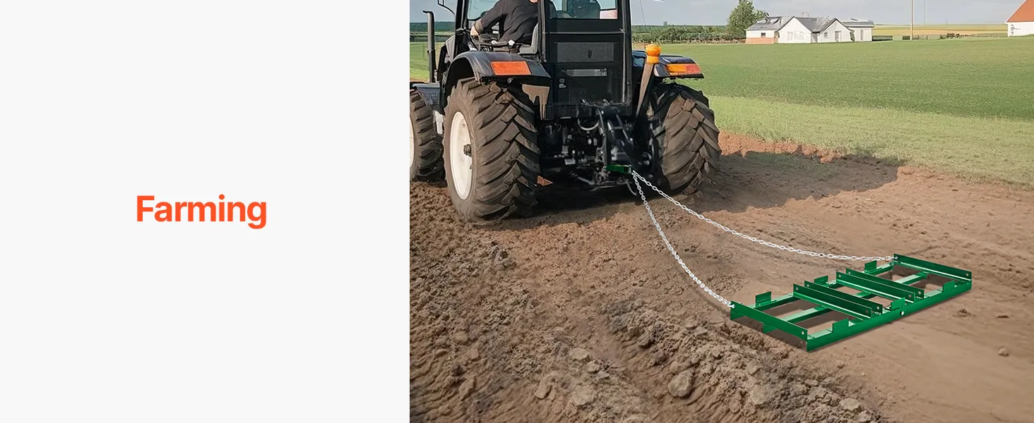Wszechstronne zastosowanie: Ta brona wleczona idealnie nadaje się do wyrównywania gleby, trawy, piasku i żwiru. To idealne narzędzie do wyrównywania pól, podjazdów, parkingów i innych miejsc, dzięki któremu uprawa ziemi staje się wydajna i bezproblemowa.