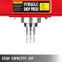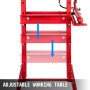 czerwona prasa hydrauliczna VEVOR z regulowanym stołem roboczym i niebieskimi strzałkami.