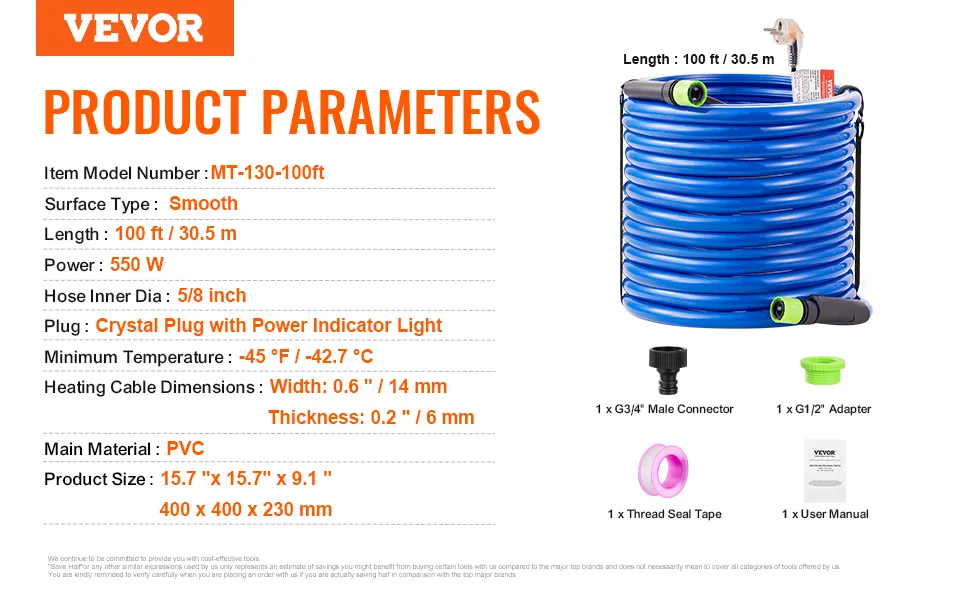 Wąż do podgrzewania wody VEVOR 100 stóp do kamperów, podgrzewany wąż do wody pitnej z zabezpieczeniem przed zamarzaniem do -45°F, automatycznie samoregulujący, średnica wewnętrzna 5/8 cala z zestawem szybkozłączek, bez ołowiu i BPA