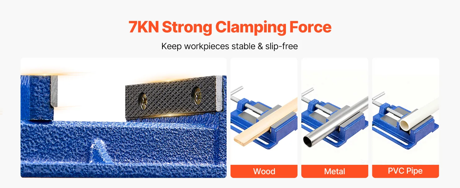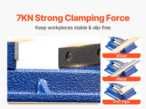 Antypoślizgowe i stabilne: To imadło maszynowe z antypoślizgowymi, teksturowanymi szczękami oferuje siłę zacisku do 7 kN, co pozwala na bezpieczne mocowanie obrabianych przedmiotów. Skutecznie zapobiega poślizgowi, zapewniając stabilną pracę podczas wiercenia, grawerowania, szlifowania i innych prac.